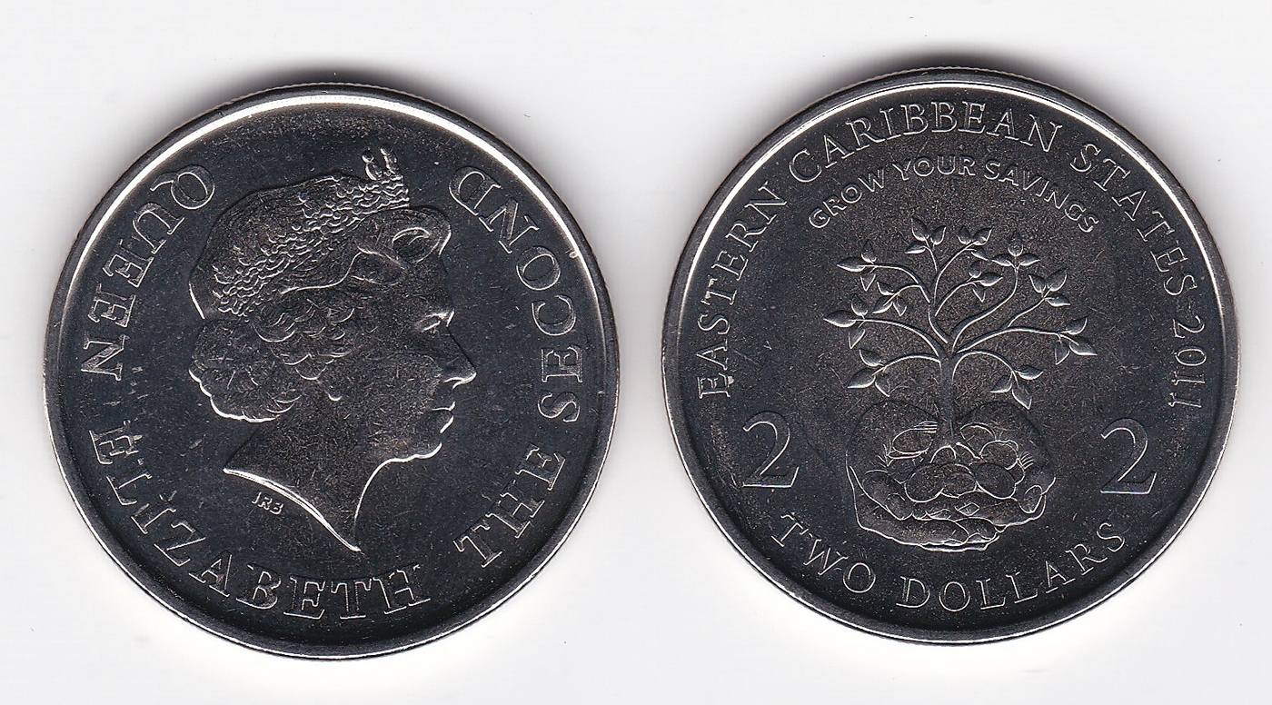 Монета номиналом 2 доллара "Денежное дерево". Восточные Карибы. 2011 год