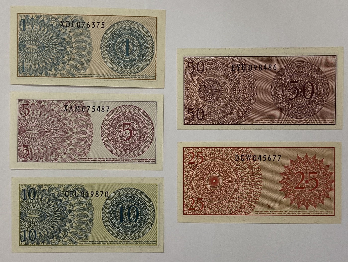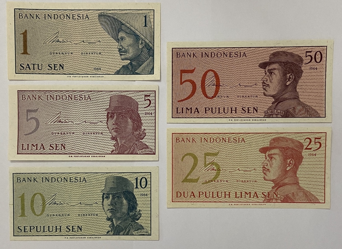 Набор банкнот от 1 до 50 сен (5 штук). Индонезия. 1964 года.