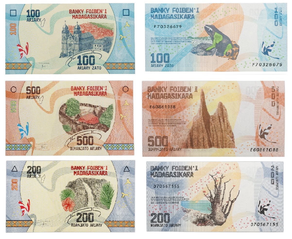 Набор банкнот номиналом 100, 200 и 500 ариари (3 штуки). Мадагаскар. 2017 год.