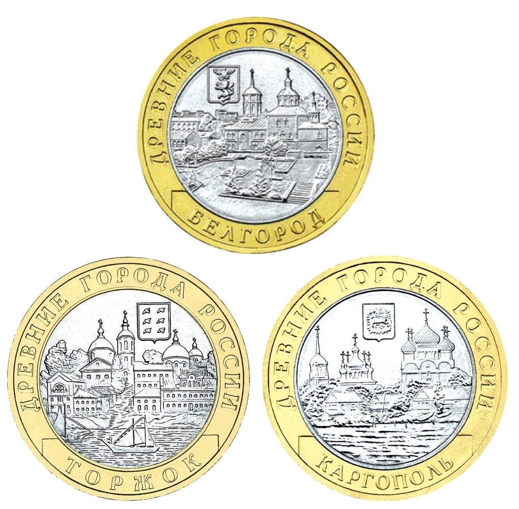 Полный набор биметаллических монет 2006 года серии "Древние города России" (3 штуки).