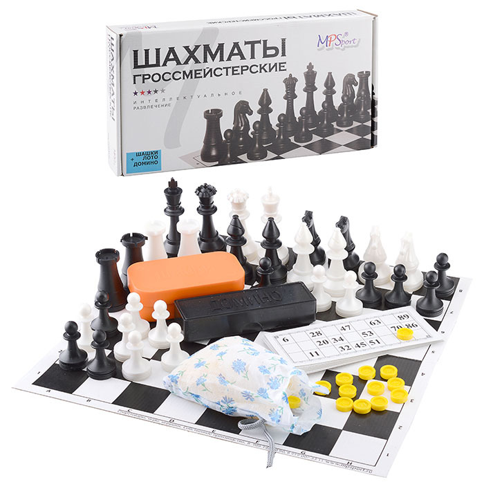 Набор игр "Интеллект" 4 в 1 шахматы гроссмейстерские, лото,шашки, домино (пластик) шахматное поле.