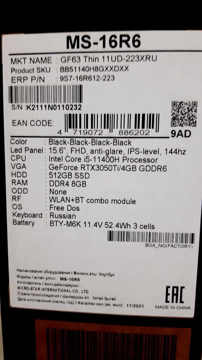 15.6" Игровой ноутбук MSI Modern 15 A11SBU-659XR, Intel Core i5-1155G7 (2.5 ГГц), RAM 8 ГБ, SSD 512 ГБ, NVIDIA GeForce MX450 (2 ГБ), Без системы, (9S7-155266-659)