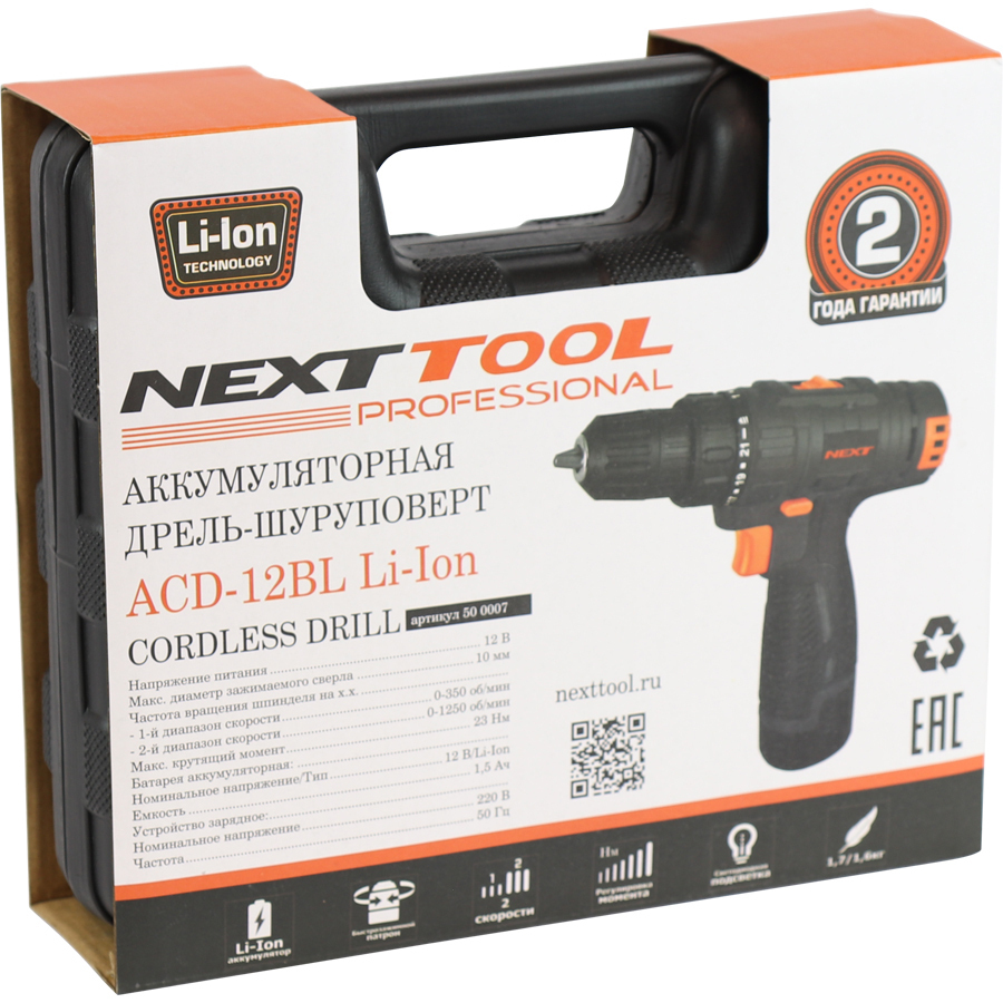 Дрель-шуруповерт NEXTTOOL ACD-12BL FPG, От аккумулятора, 12 В, 23 Нм, 1 АКБ