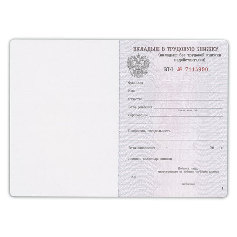 Бланк документа Вкладыш в трудовую книжку, 88х125 мм, ГОЗНАК