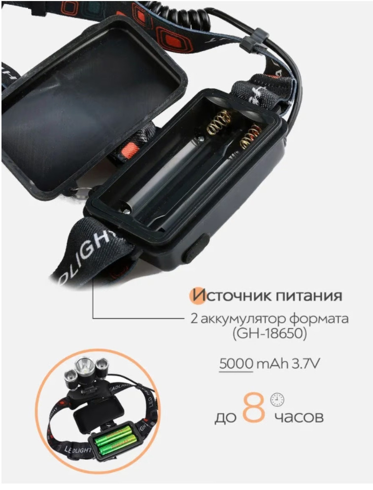 Фонарь налобный аккумуляторный/спортивный/светодиодный/бытовой фонарик туристический в поход