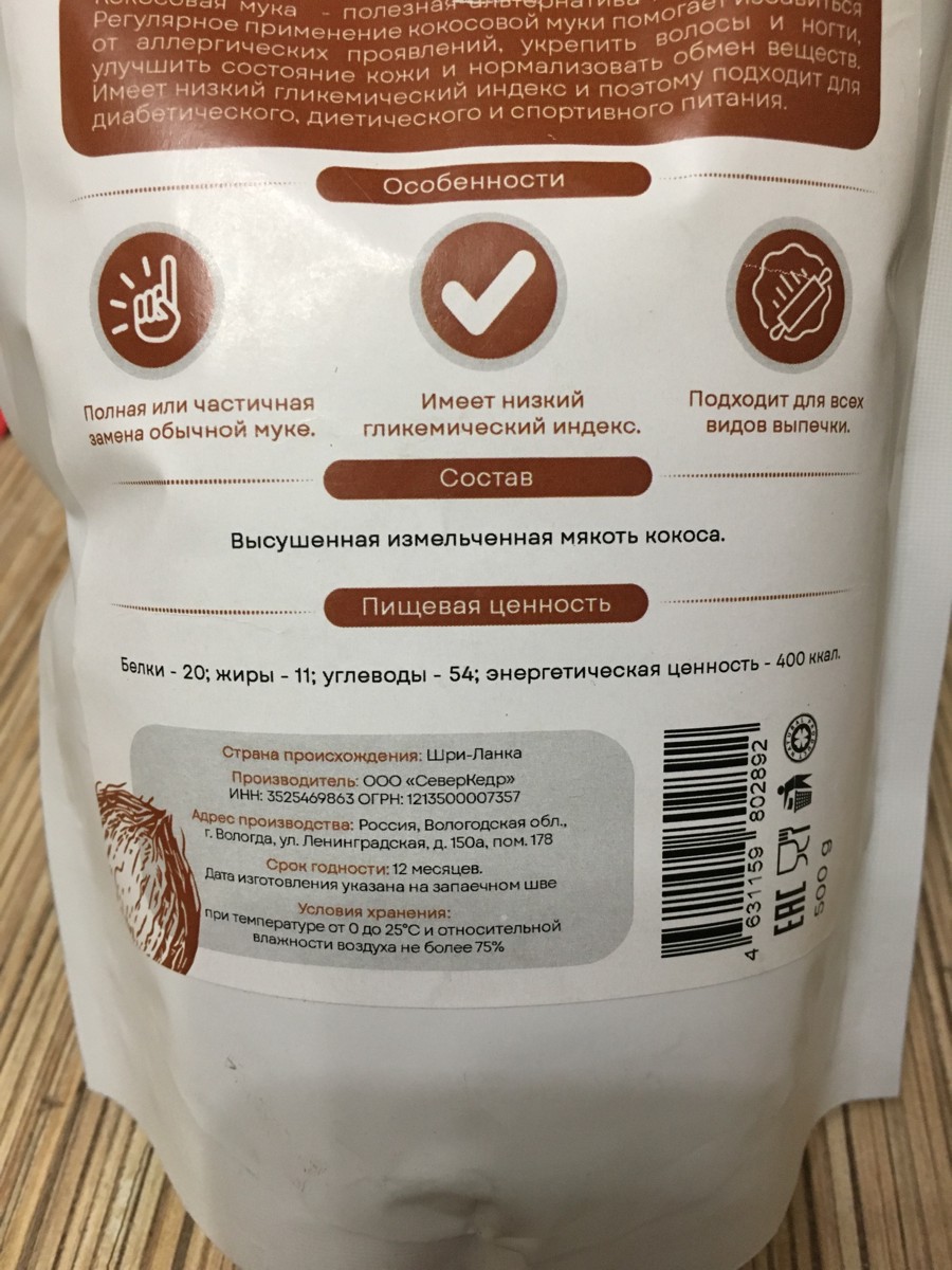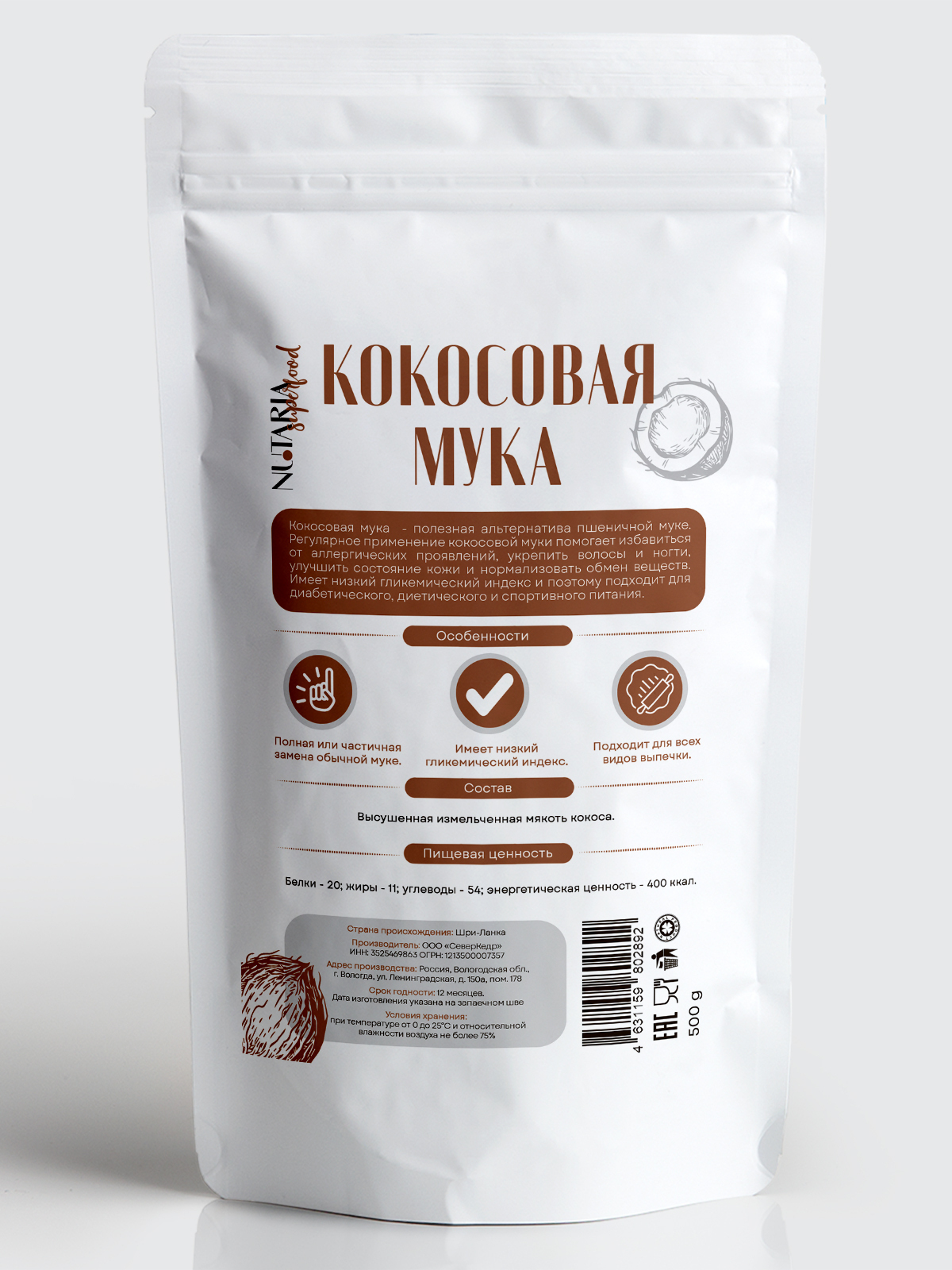 Кокосовая мука, без глютена, пп продукты, правильное питание продукты, без сахара, 500 грамм