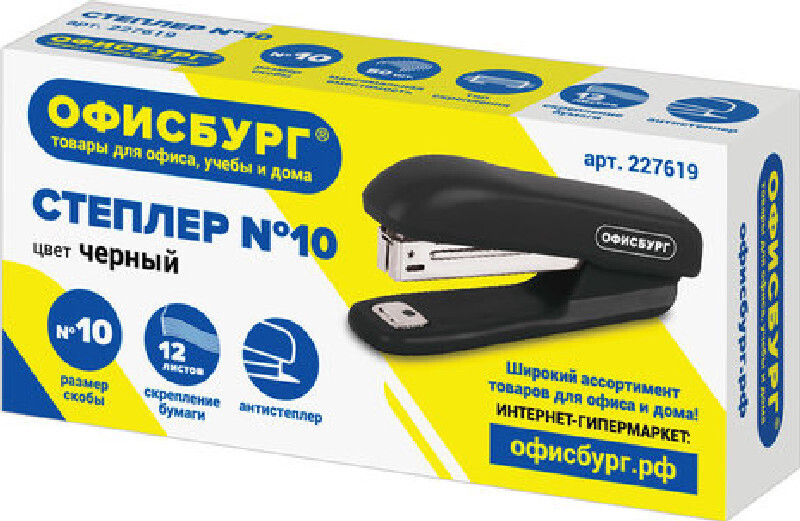 Степлер №10 ОФИСБУРГ, до 12 листов, с антистеплером, черный, 227619 2 штуки