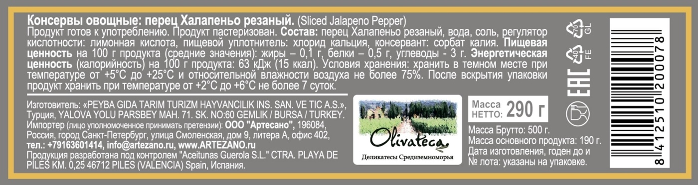OLIVATECA Оливатека Перец Халапеньо резаный, 290 г