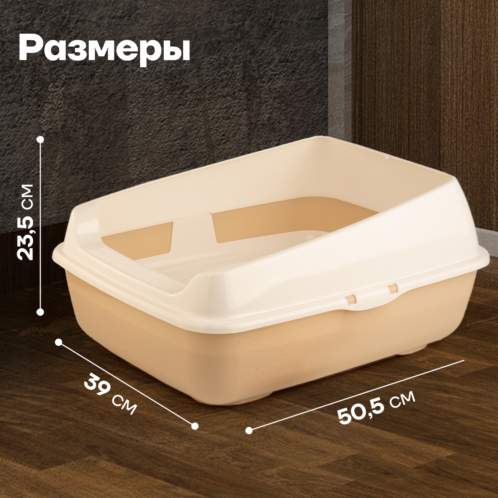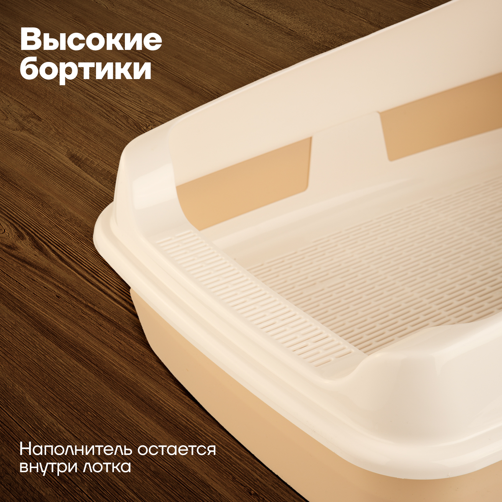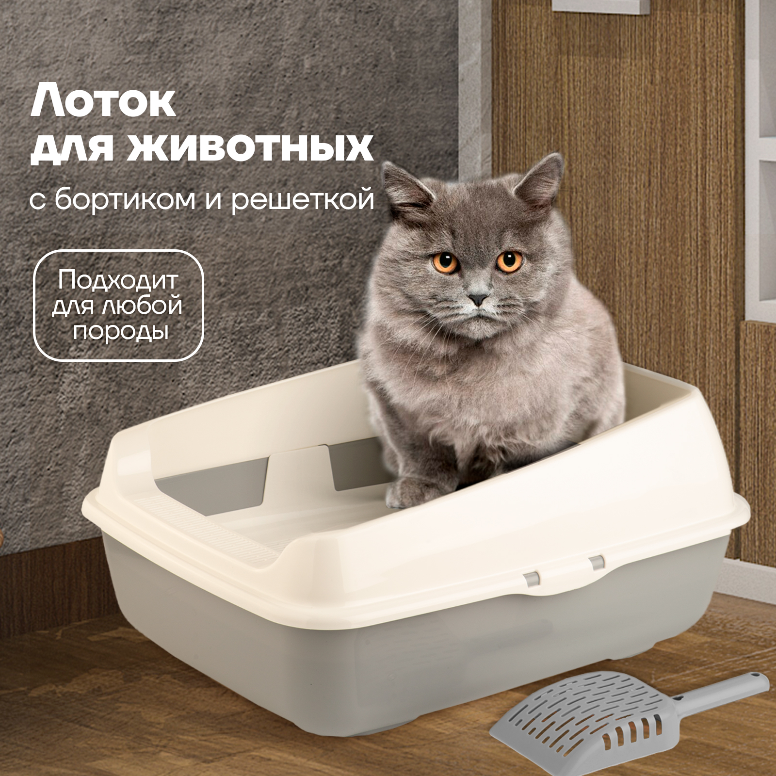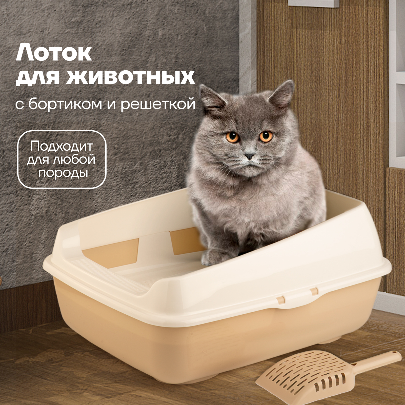 Набор/ Лоток для котов и кошек с высокими бортами, сеткой, совком/бежевый/для кота и котика