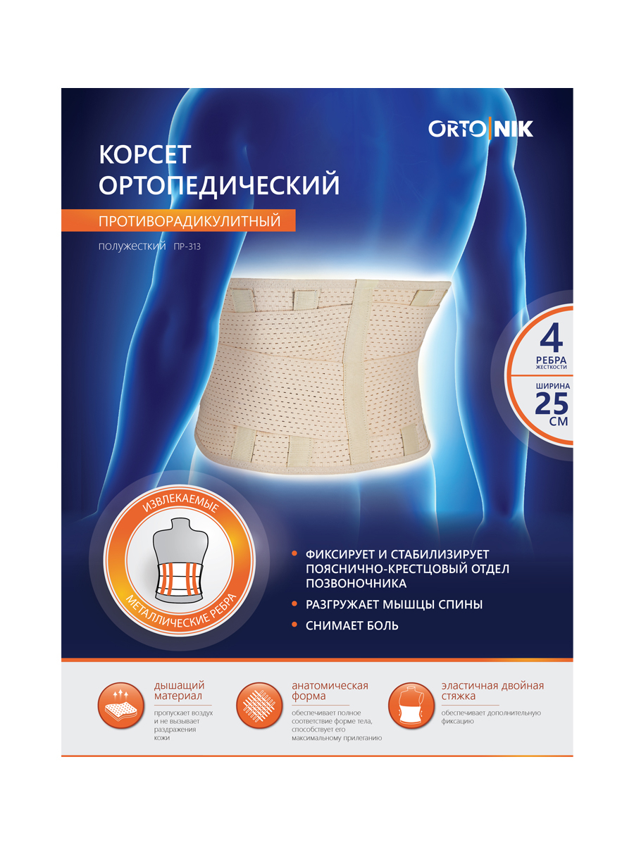 Корсет ортопедический противорадикулитный усиленный Орт.ПР-313 ус., ширина: 25 см, кол-во рёбер жёсткости: 4, Бежевый, №2, S, 70-83 см