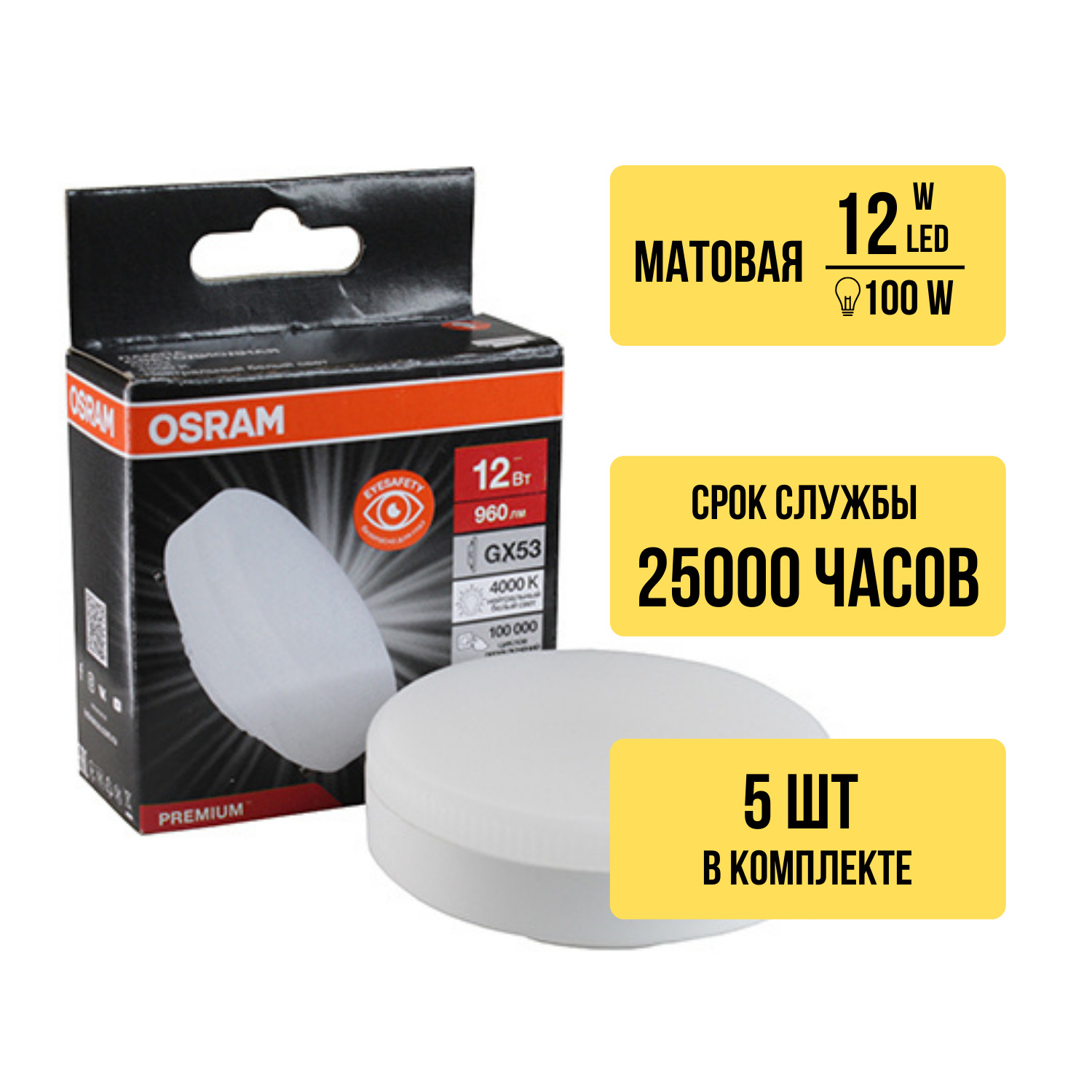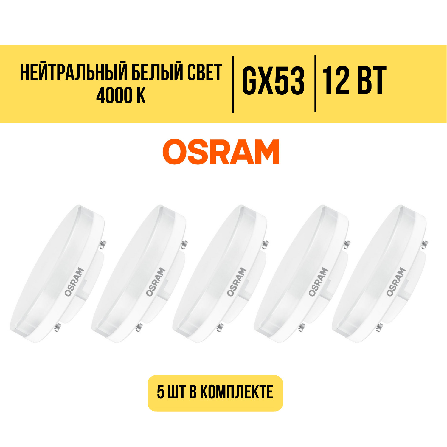 Лампочка OSRAM Таблетка GX53, 12 Вт, 4000К, 230В, Нейтральный белый свет, Светодиодная, 5 шт.
