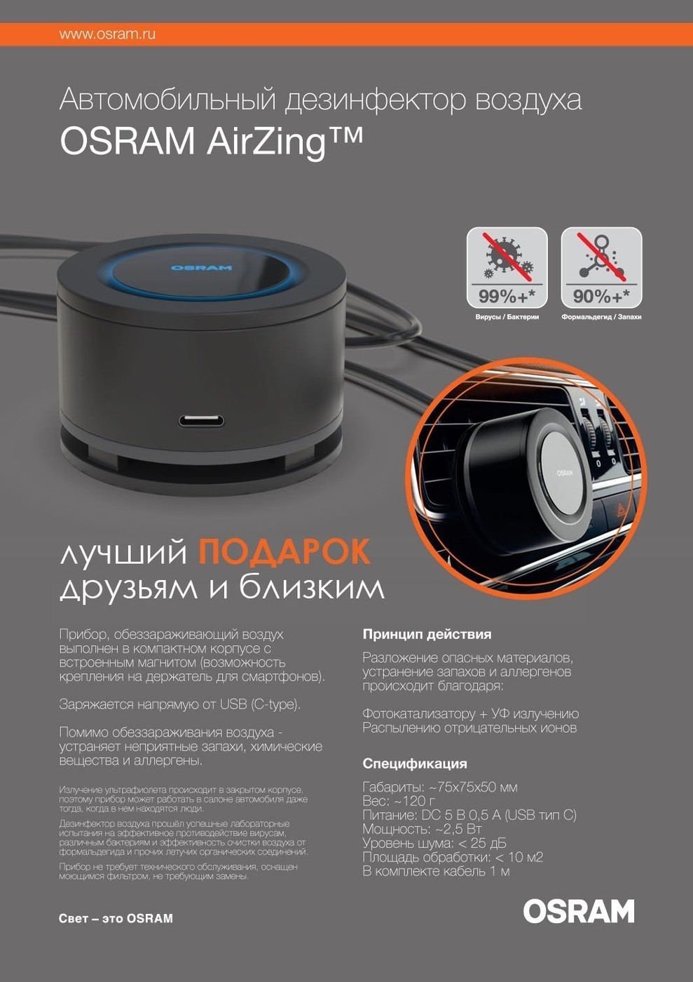 Автомобильный дезинфектор воздуха OSRAM LED AIR ZING101 с кабелем USB