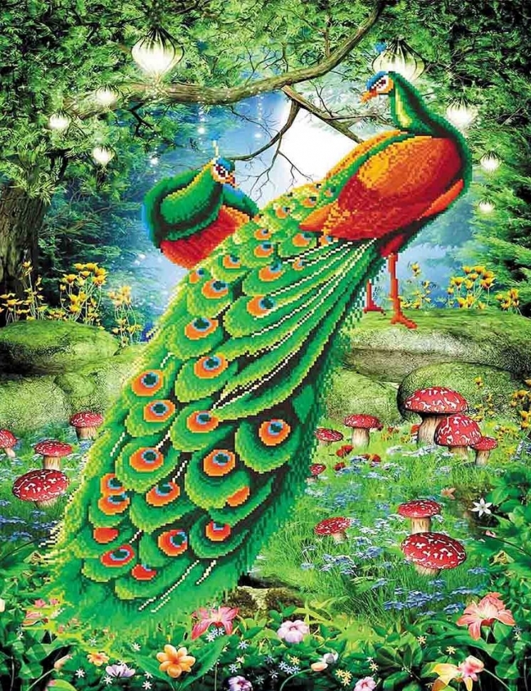 Алмазная мозаика 40х50 полная выкладка холст на подрамнике Павлины в лесу с мухоморами