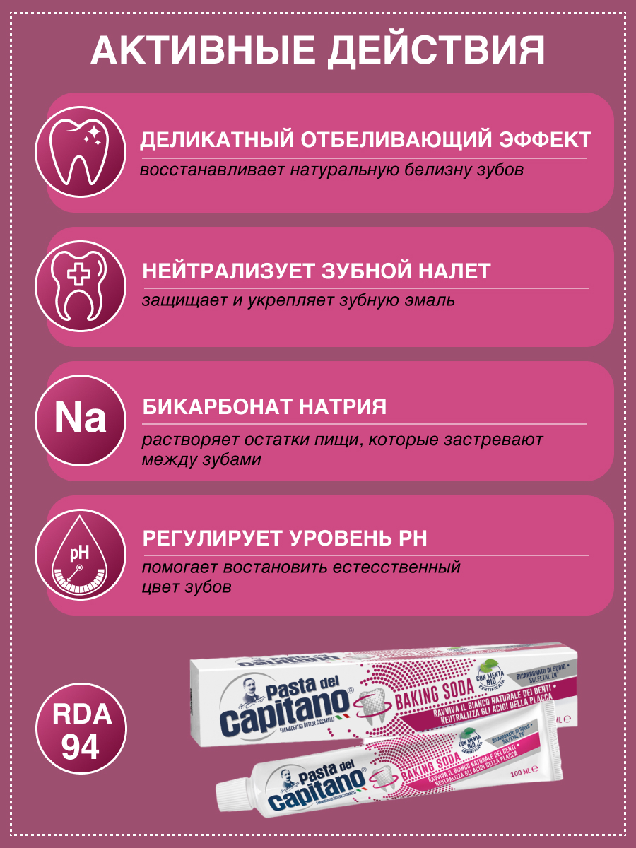 Pasta del Capitano Baking Soda Зубная паста Отбеливание Пищевая сода БЕЗ ФТОРА, 100 мл