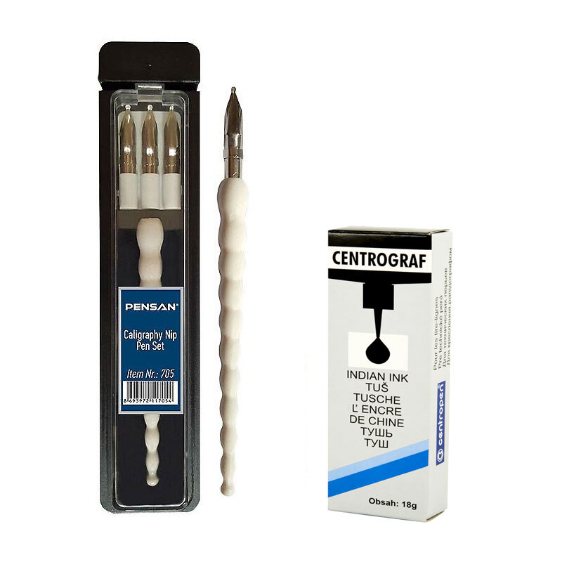 Набор для каллиграфии 3 универсальных пера с держателем Pensan и тушь художественная Centropen