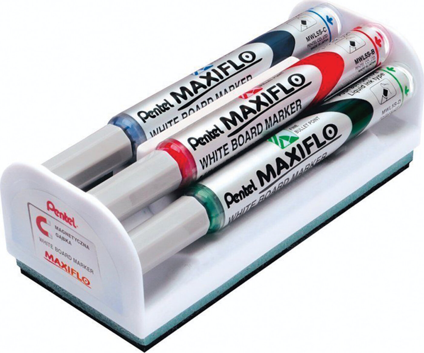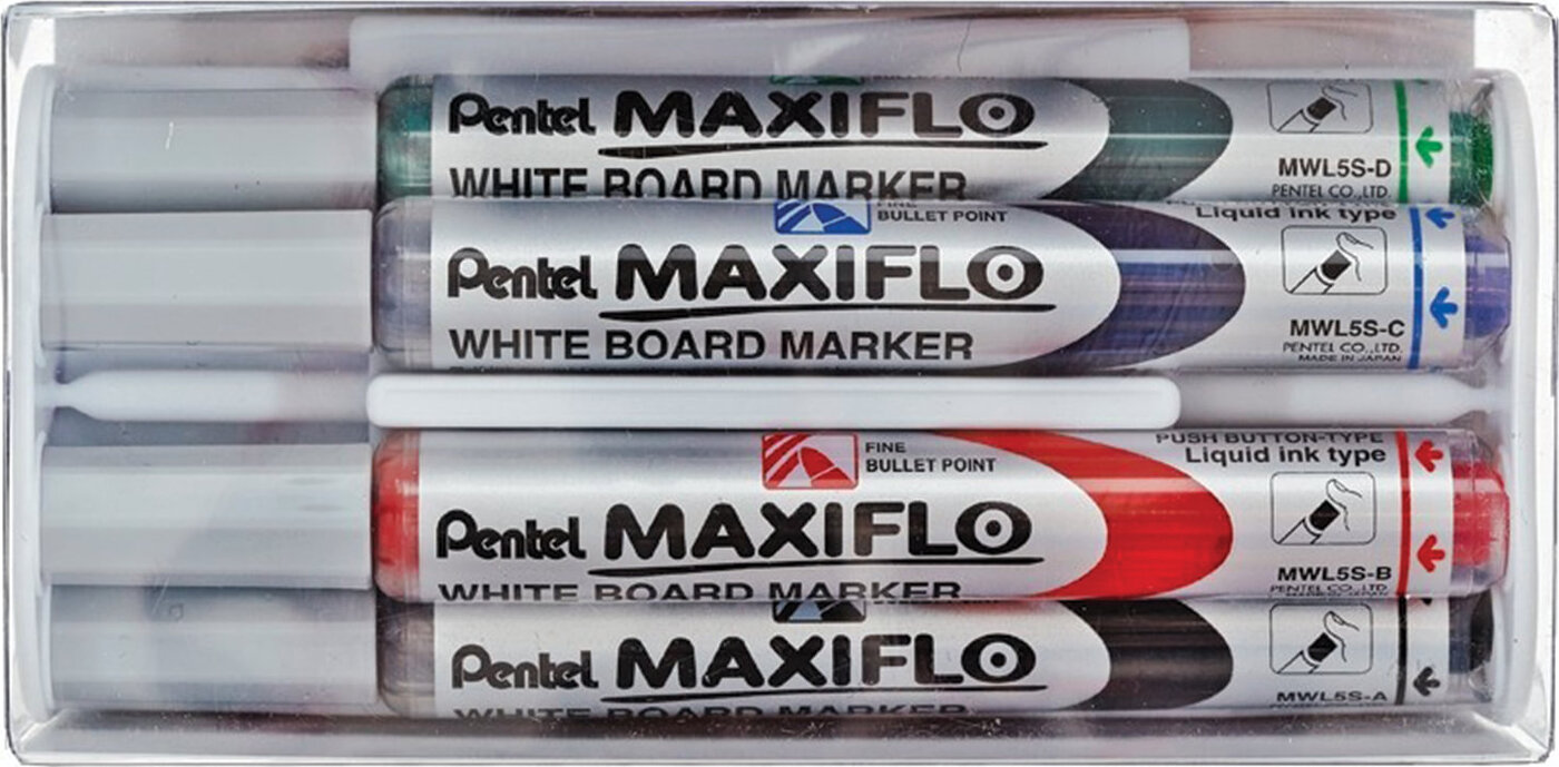 Набор для магнитно-маркерной доски (магнитный стиратель, 4 маркера), Pentel "Maxiflo", MWL5S-4N