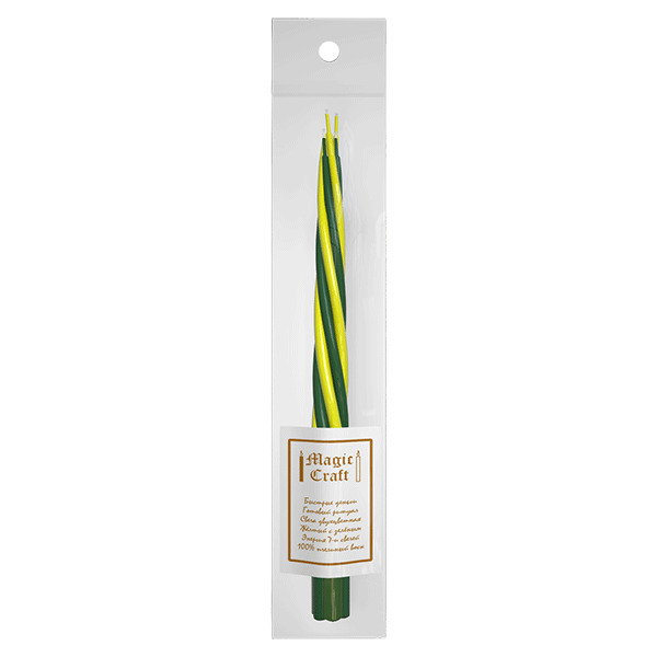 Свеча Ритуальная скрутка 7 свечей Быстрые деньги 20 см желтая с зеленым "Перо Павлина"