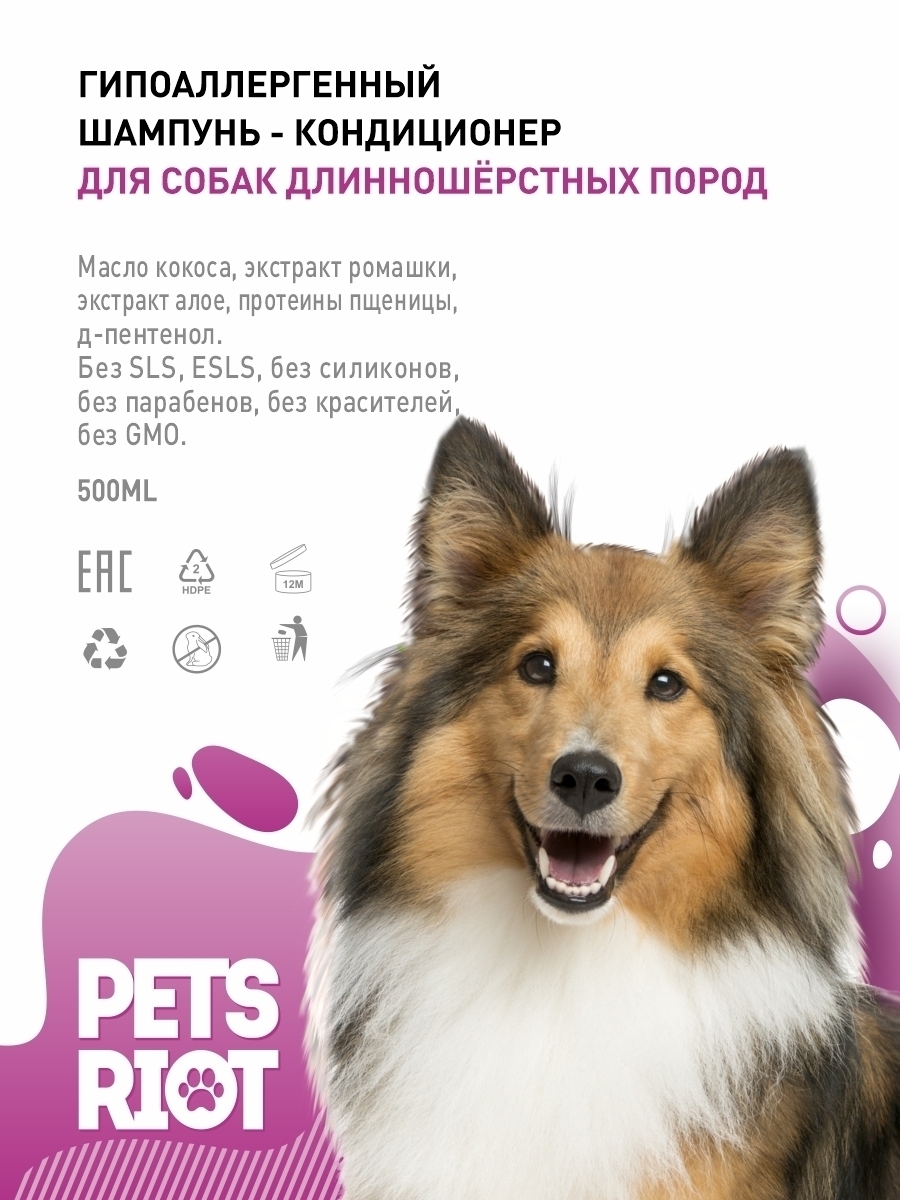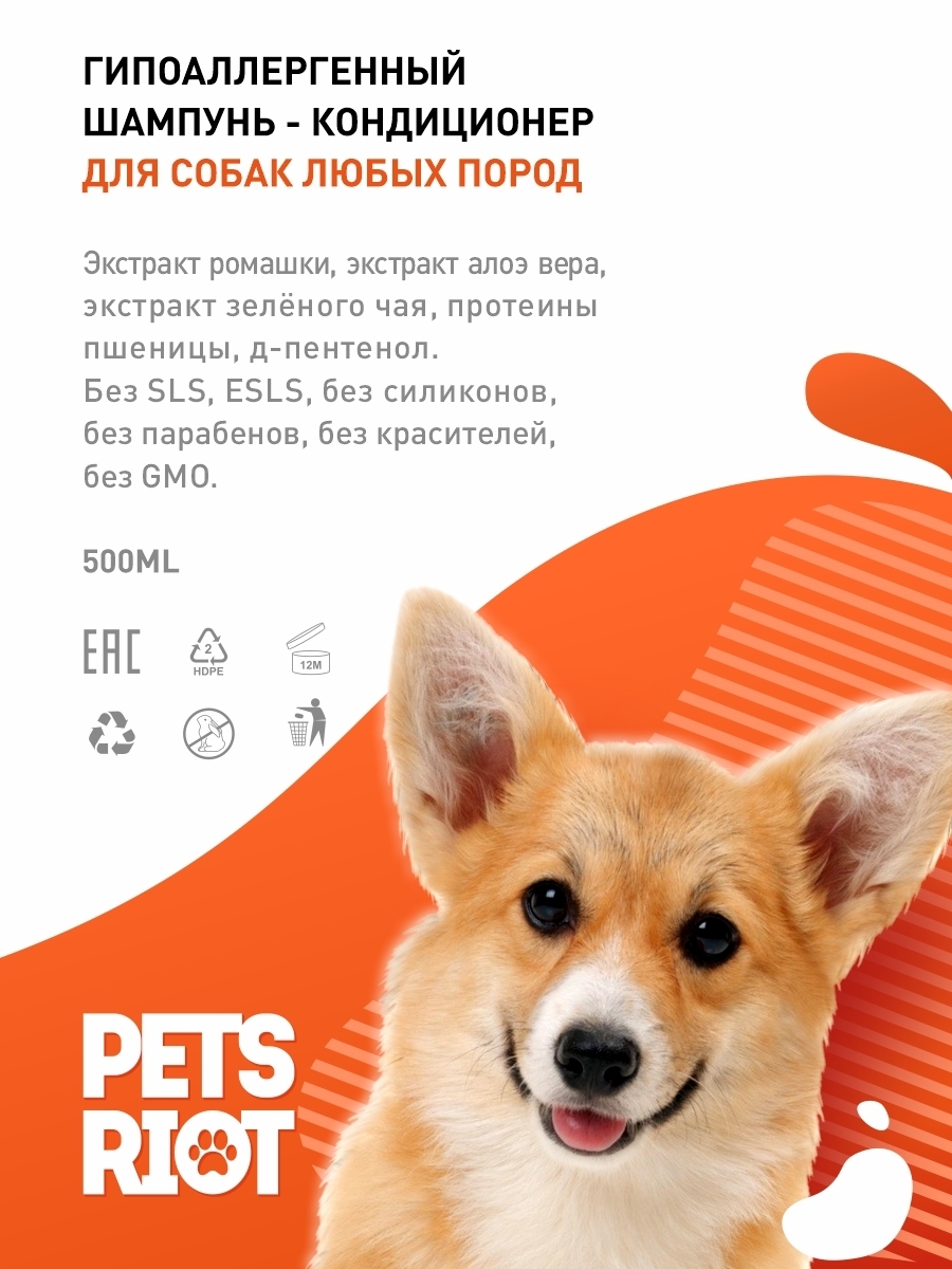 Pets Riot шампунь-кондиционер для собак любых пород 500ml, Гипоаллергенный