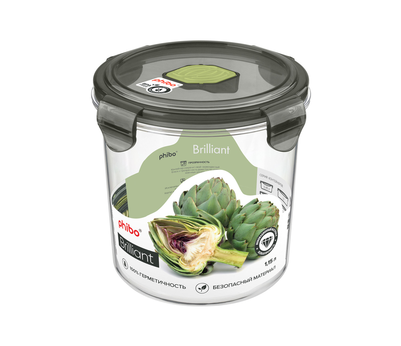 Контейнер пищевой герметичный с клапаном круглый 1,15л Brilliant (серый), Phibo