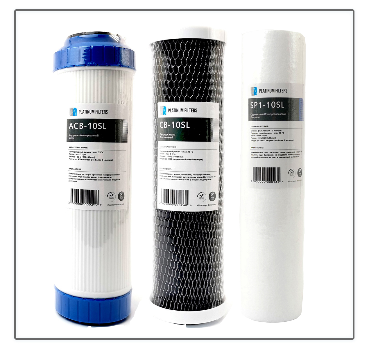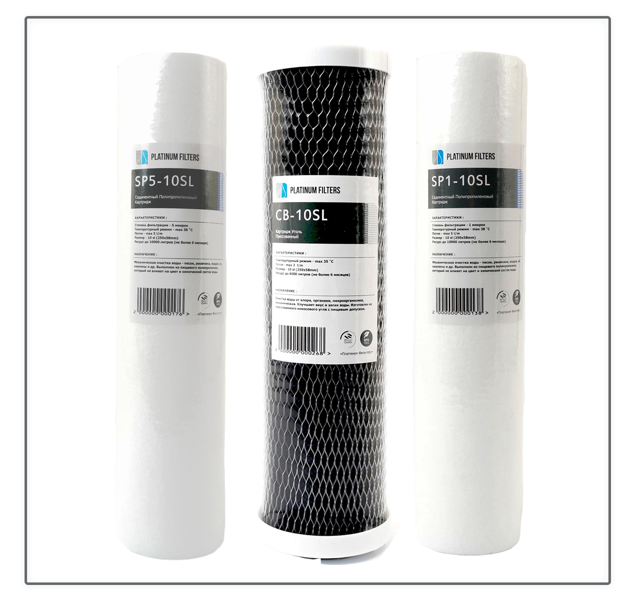 Комплект сменных картриджей Platinum Filters Standart для фильтров воды проточных и обратного осмоса