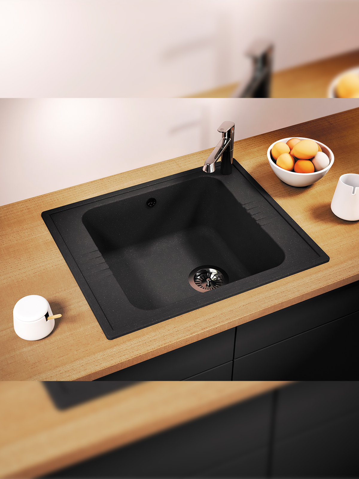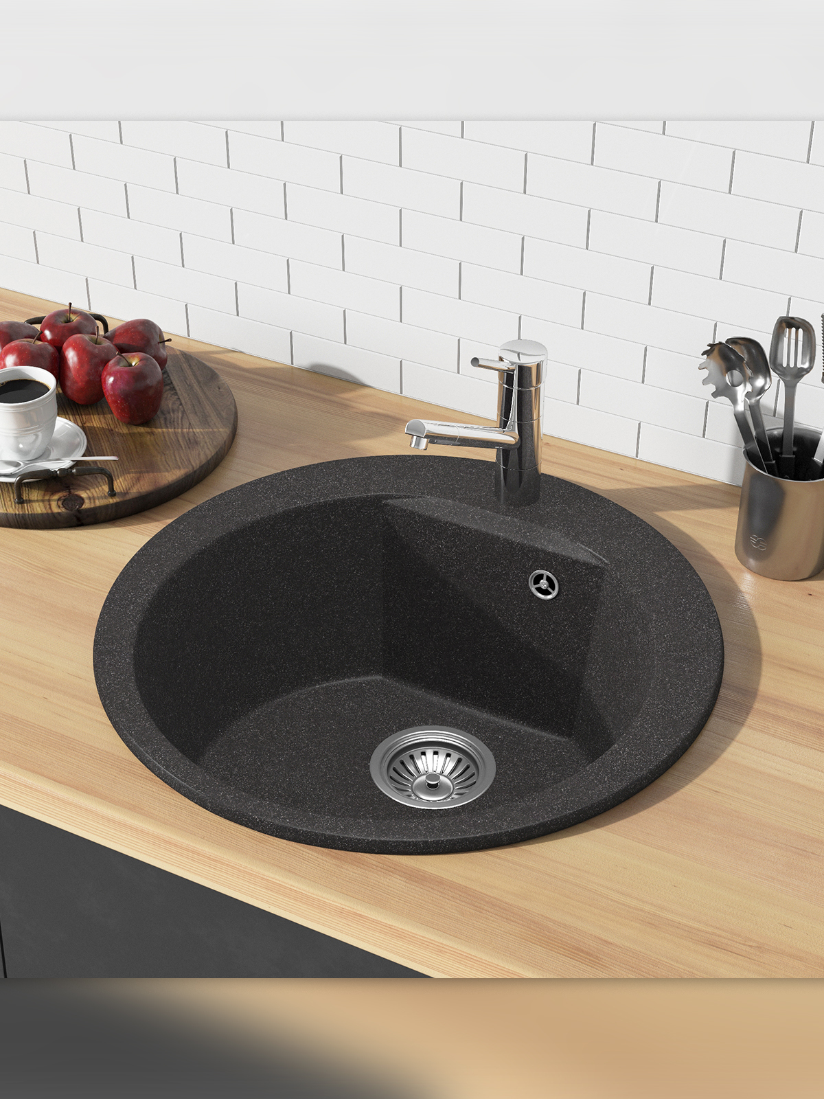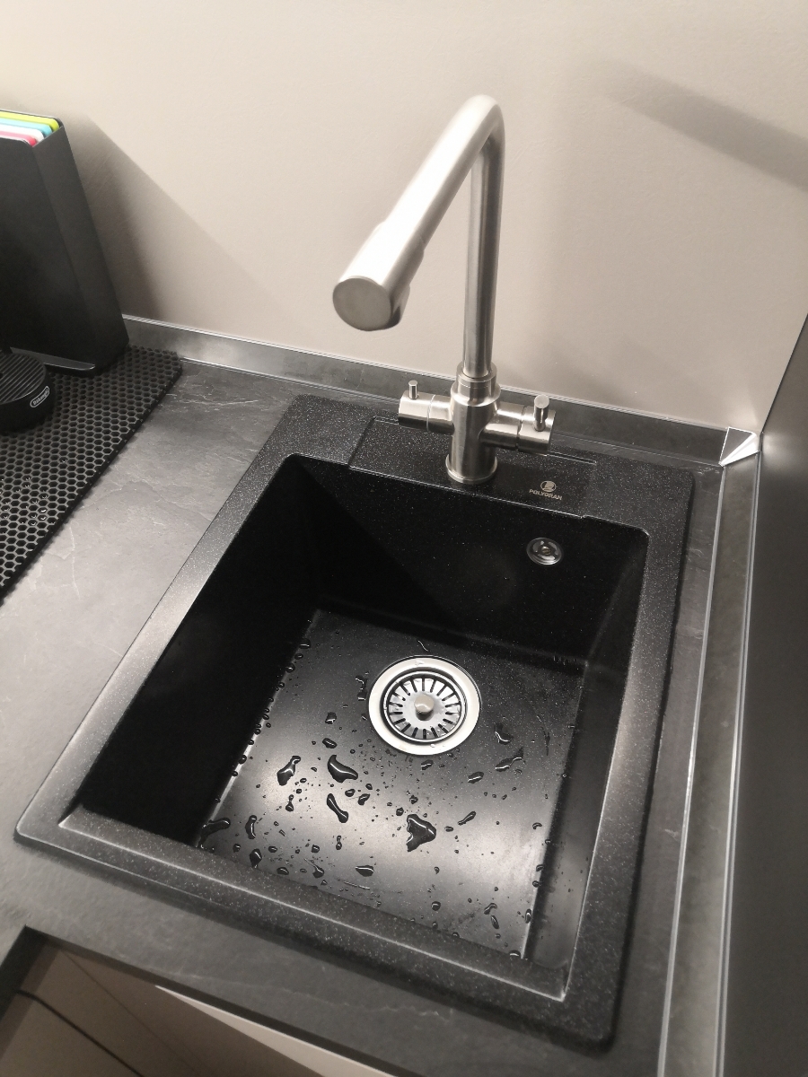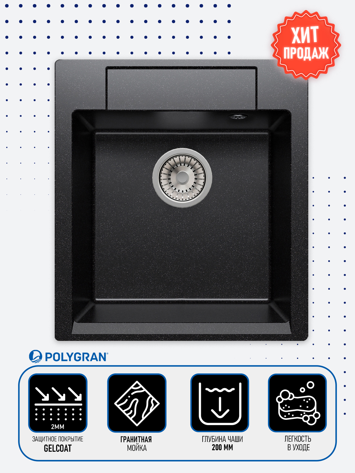 Мойка POLYGRAN, мрамор, ATOL-460, (460x200 мм), черный, сифон и сливная арматура