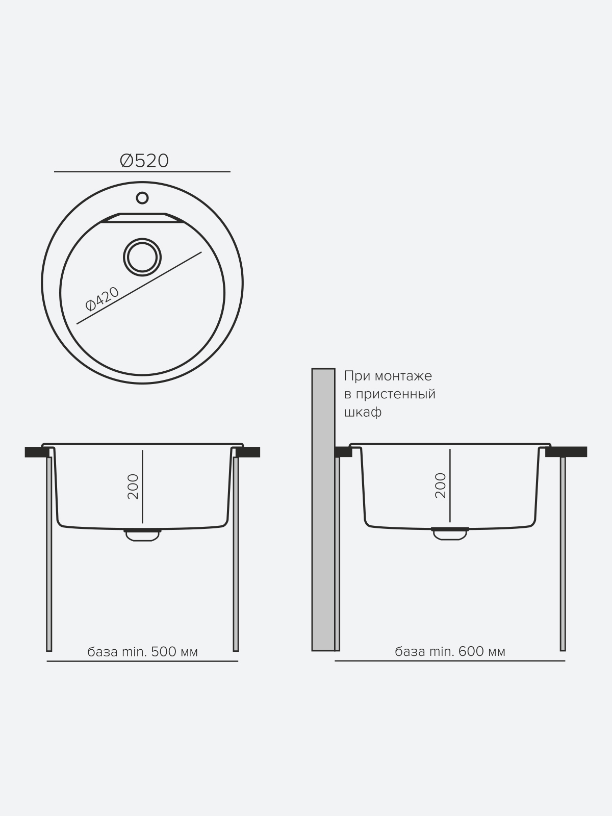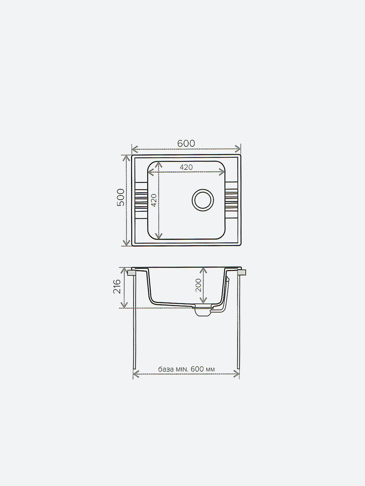 Мойка POLYGRAN, мрамор, ARGO-420, (510*420*200 мм), серый, сифон и сливная арматура