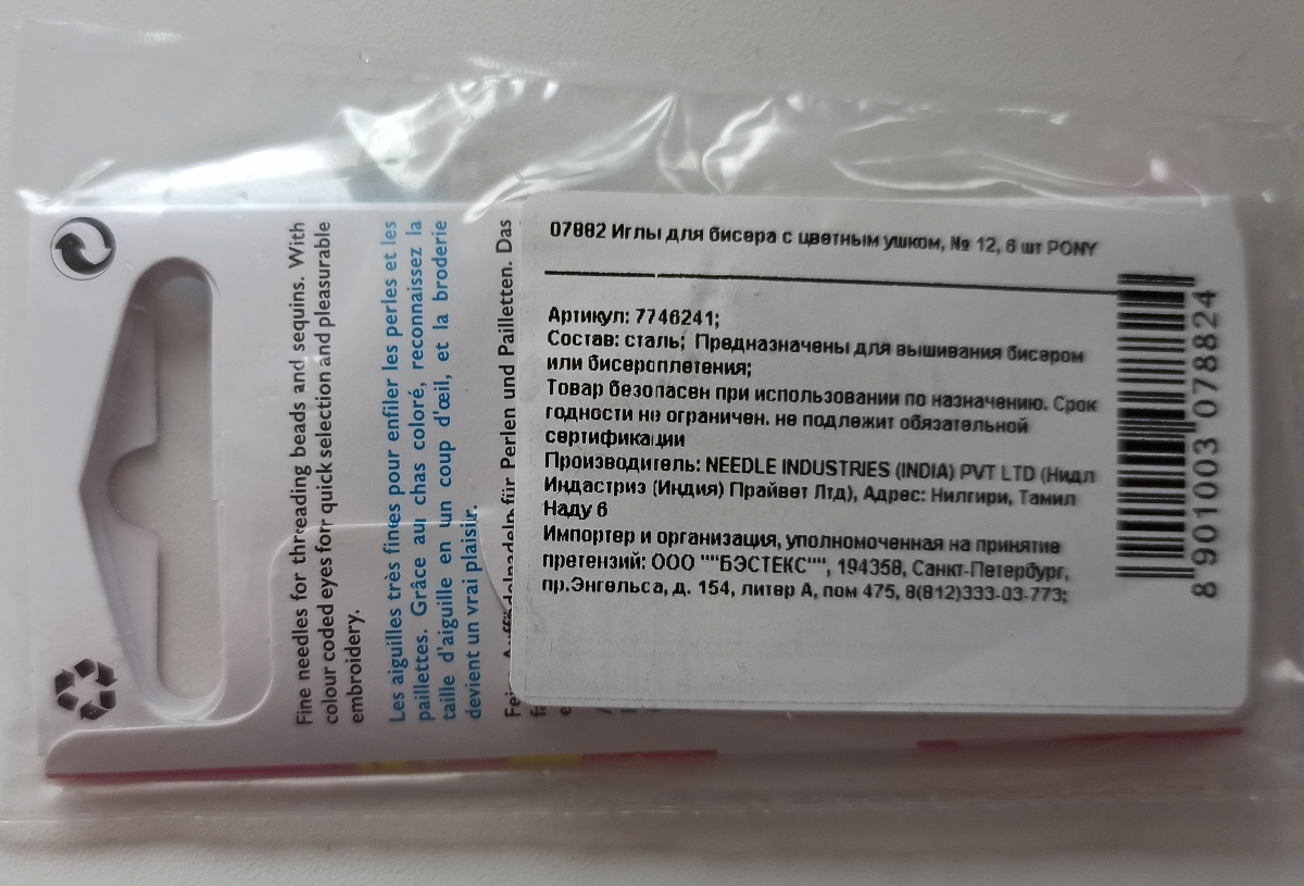 Иглы ручные Pony "Beading", для бисера, №12, 6 шт