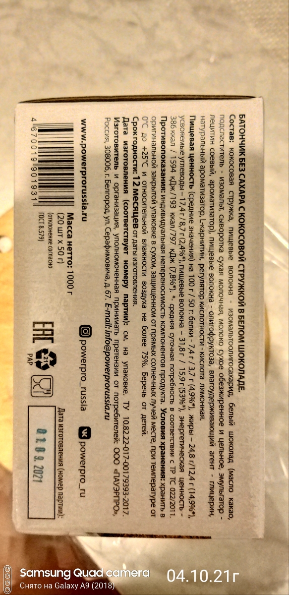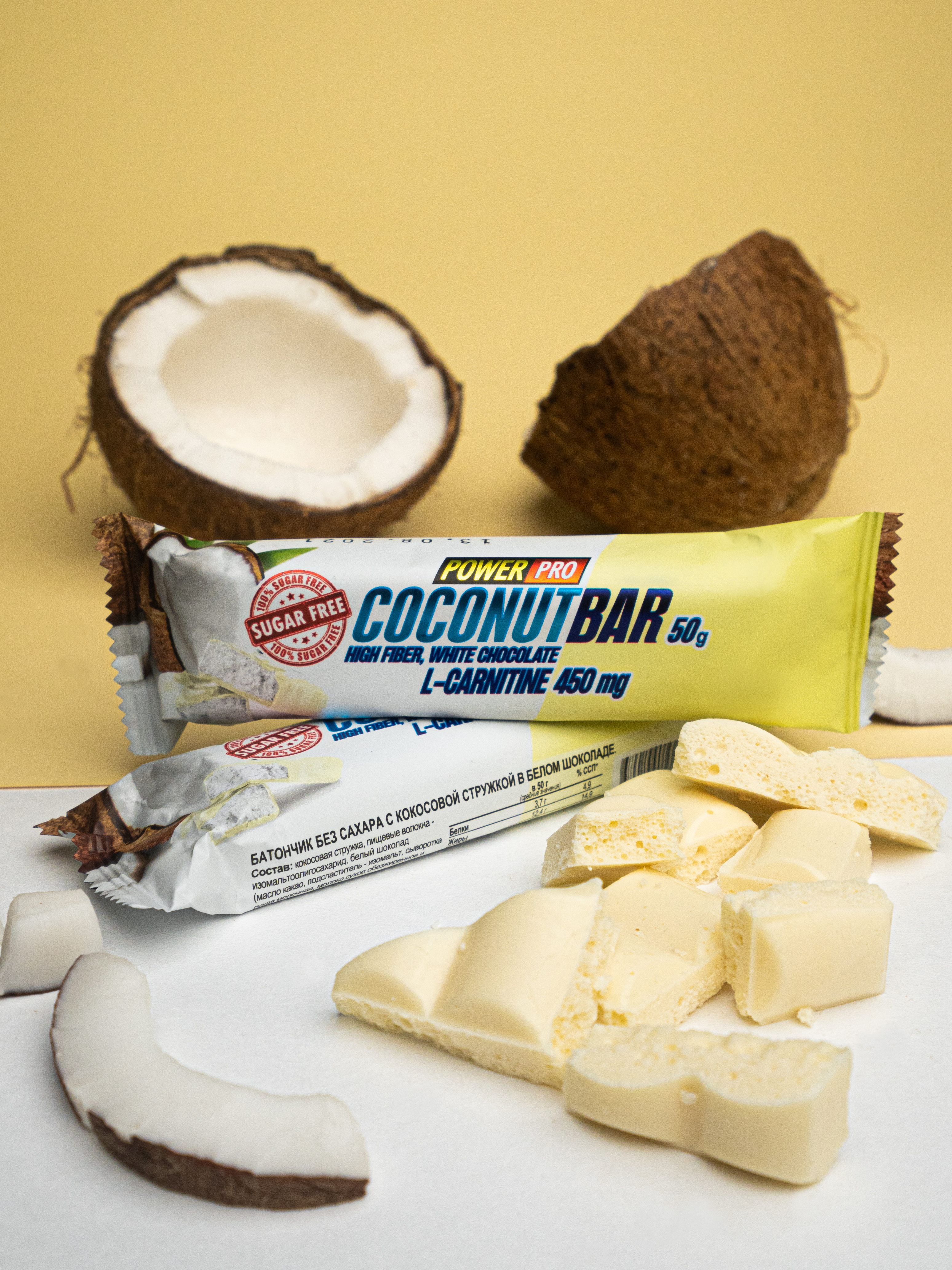Батончик БЕЗ САХАРА из мякоти кокоса с л-карнитином, в белом шоколаде