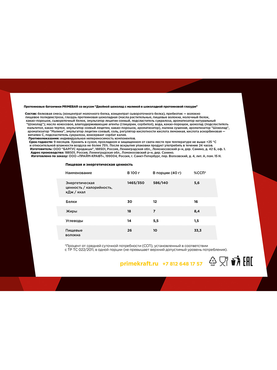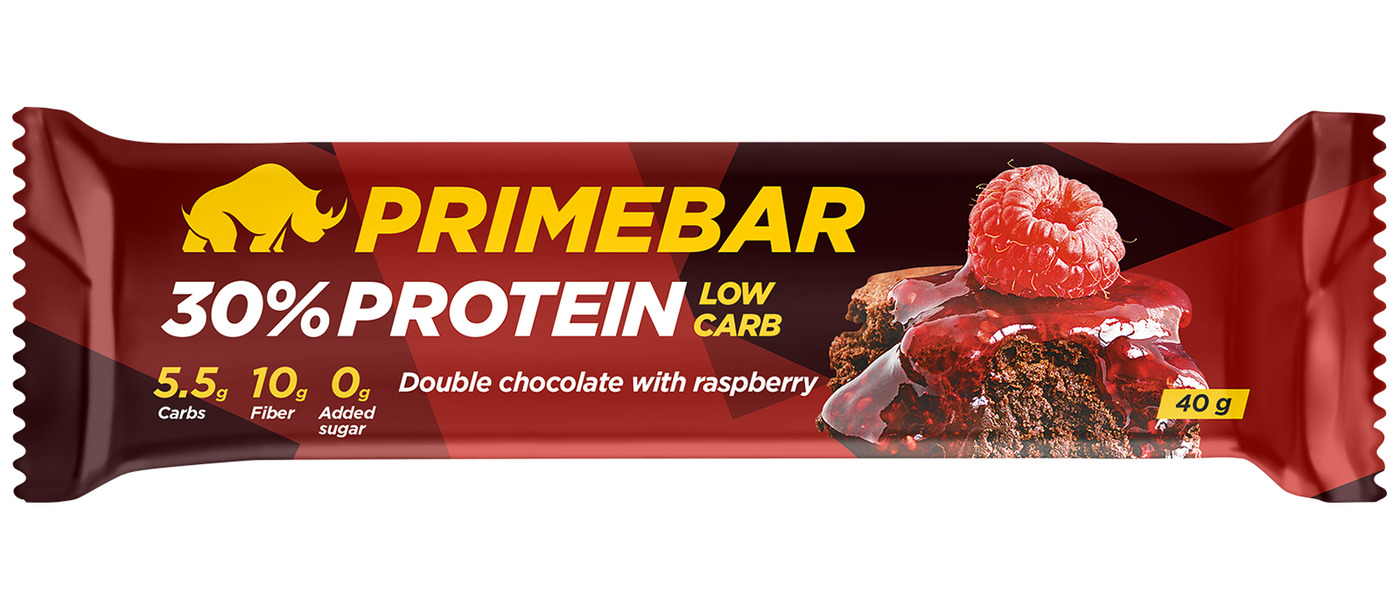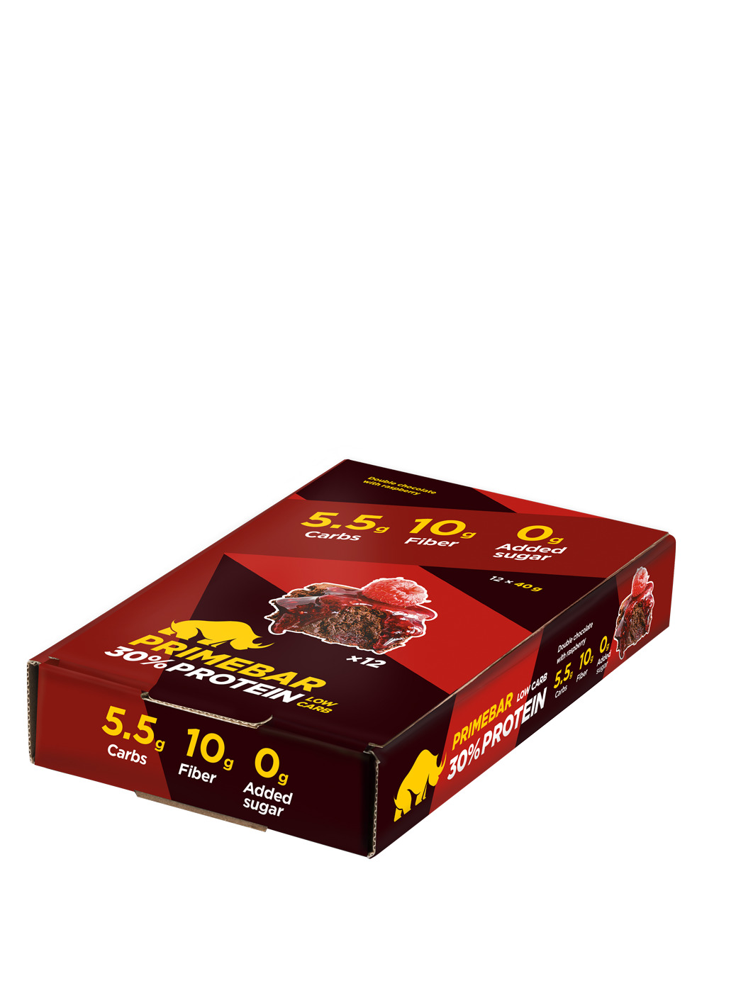 Протеиновый батончик PRIMEBAR LOW CARB Двойной шоколад с малиной, 12*40 гр