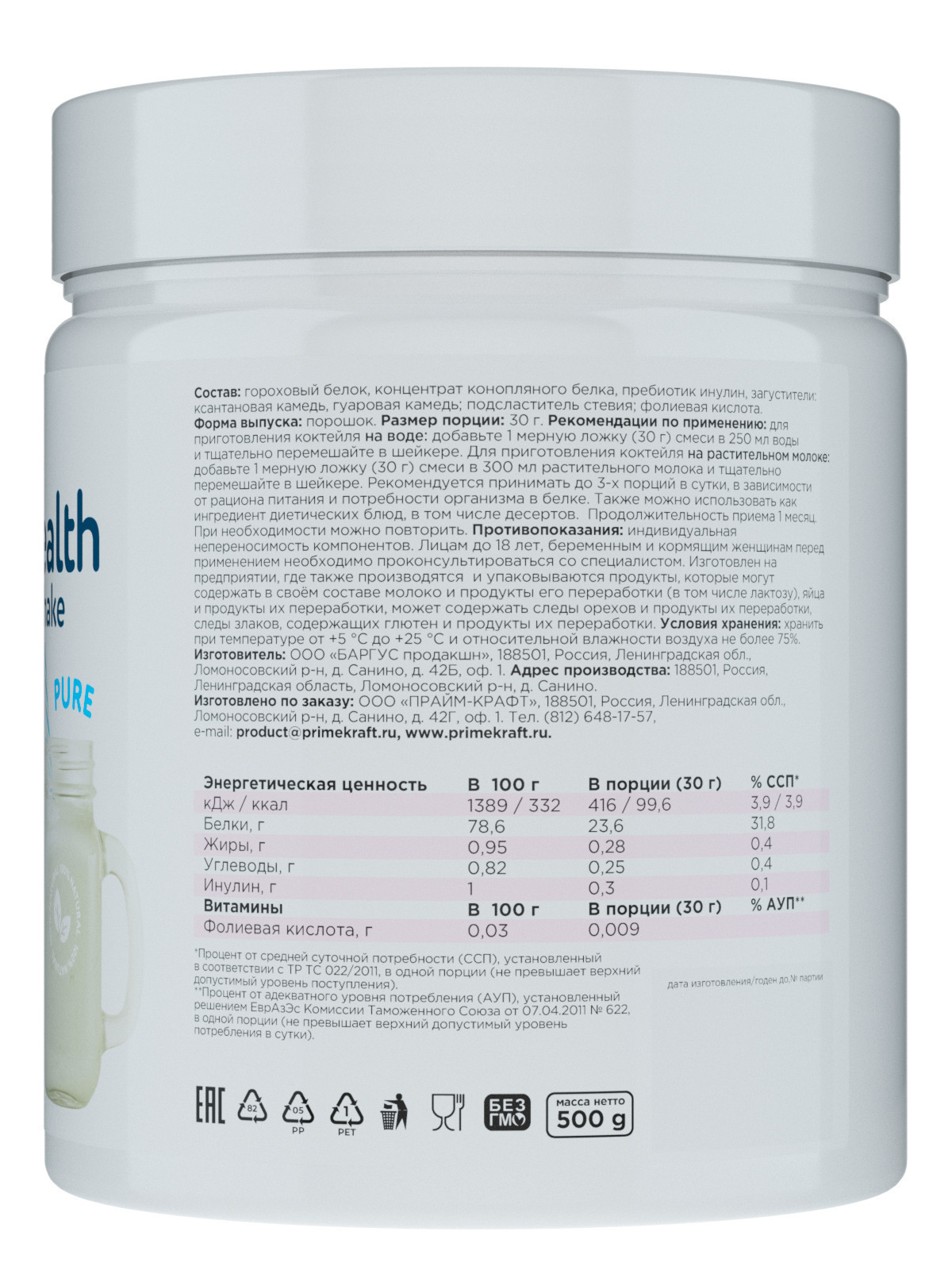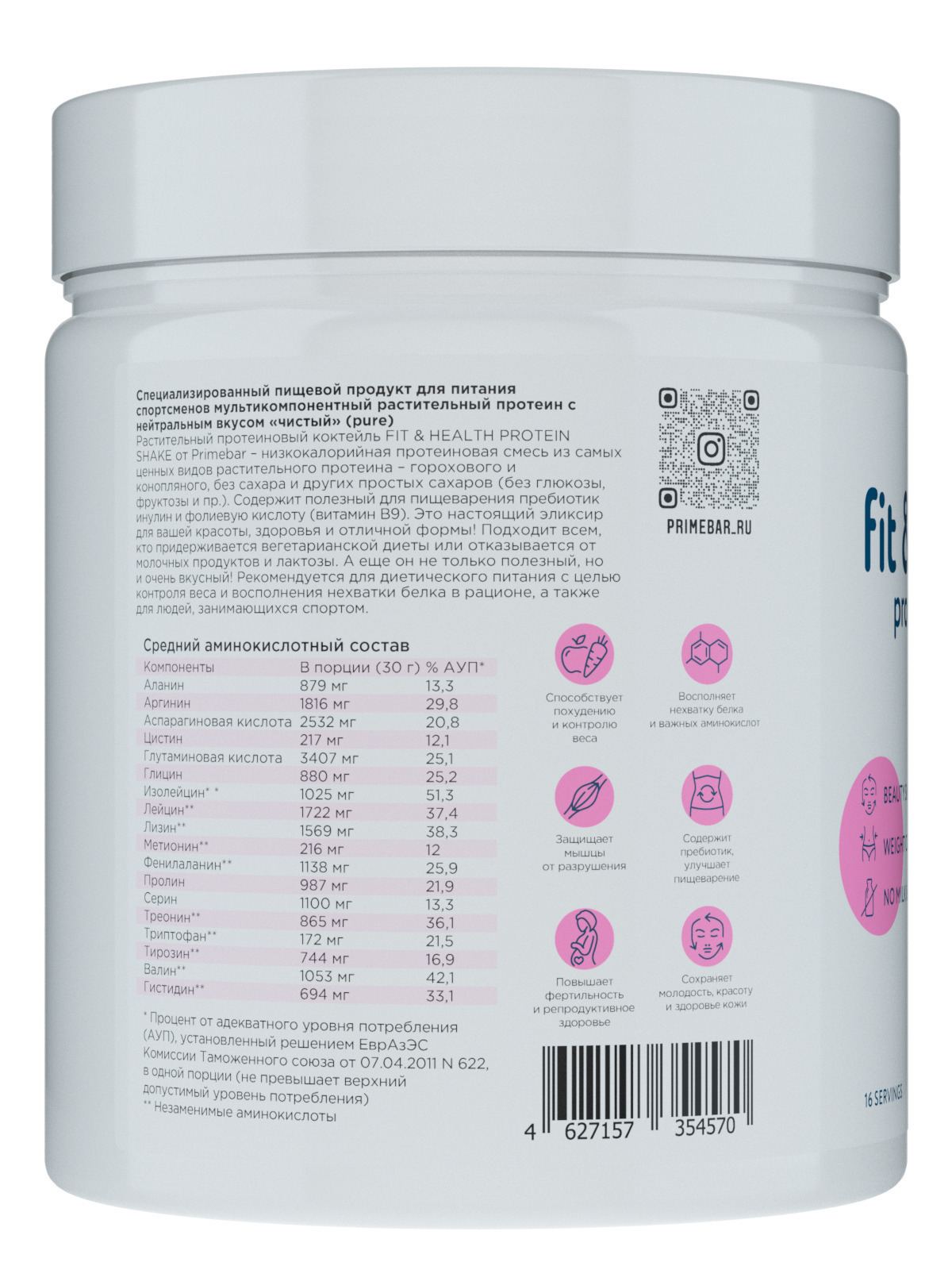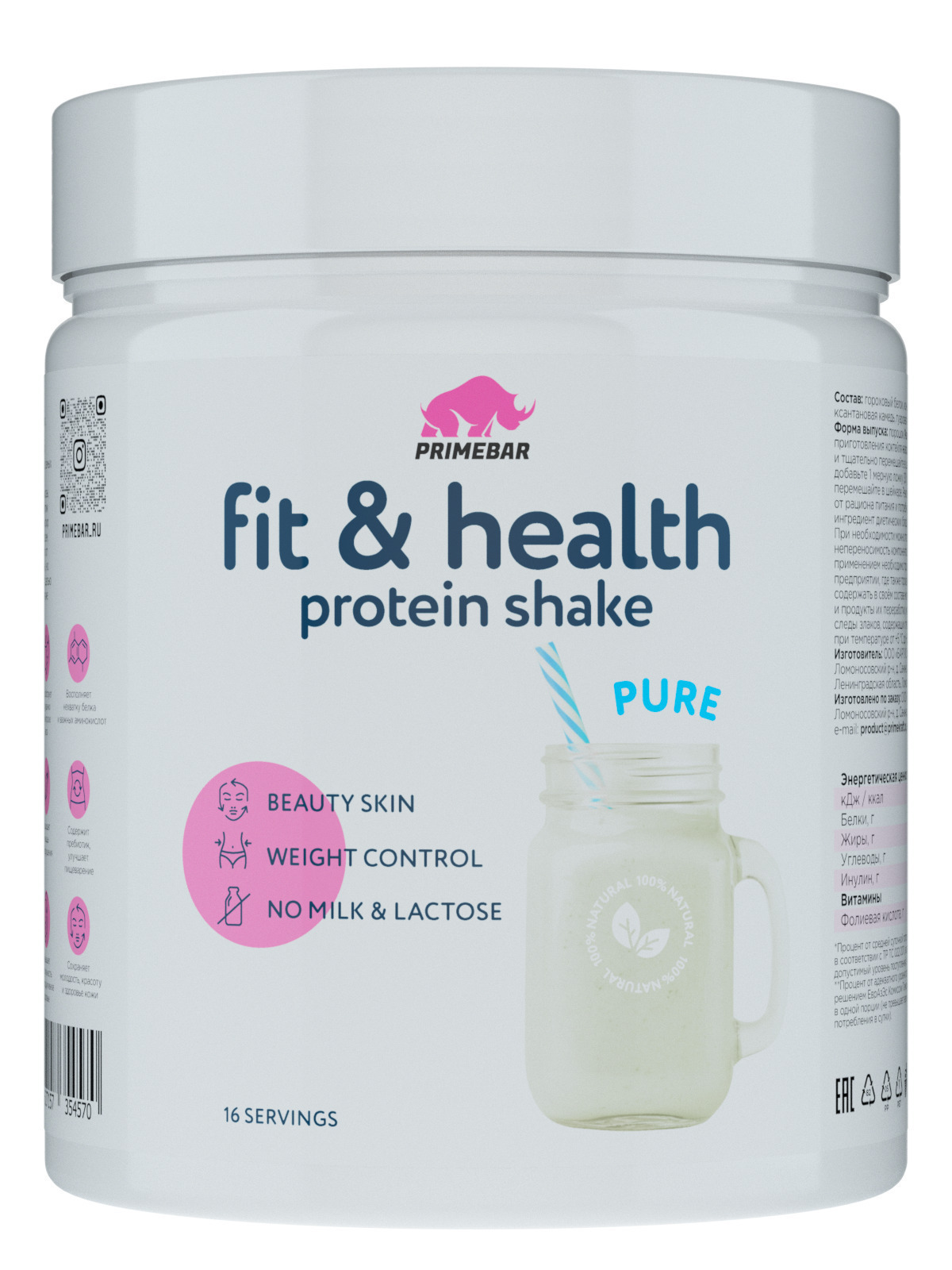 Протеиновый коктейль Fit & Health Protein Shake PRIMEBAR с нейтральным вкусом (pure), 500 г / Без лактозы