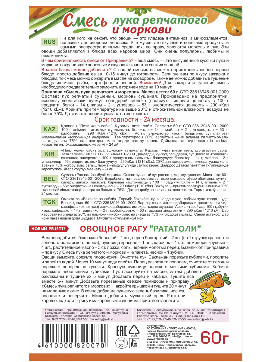 Приправа Смесь лука и Моркови, 5 штук по 60 г (Дой-пак), Приправыч