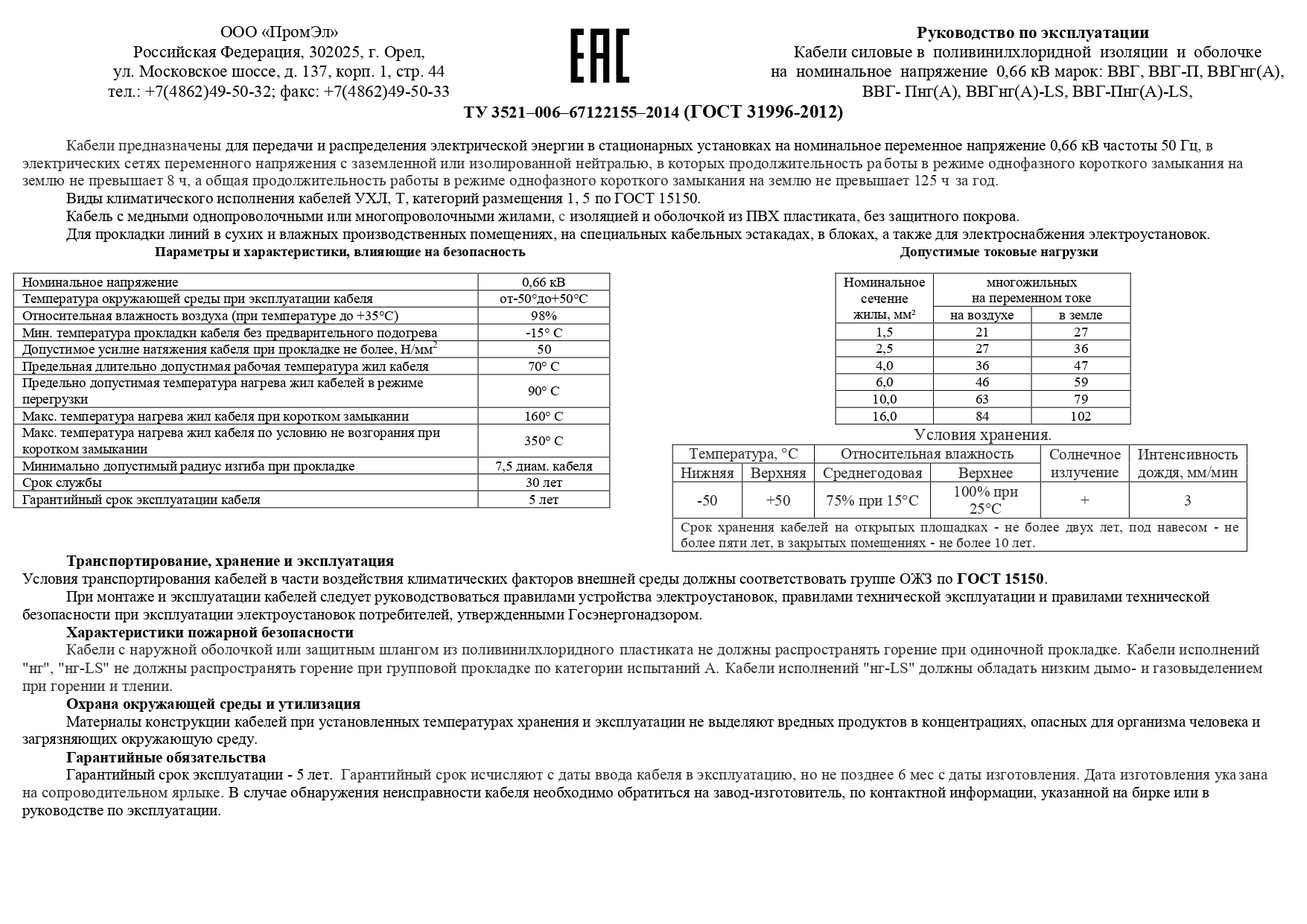 Электрический кабель ПромЭл ВВГ-Пнг(А) Трехжильный 2,5 мм², 50 м