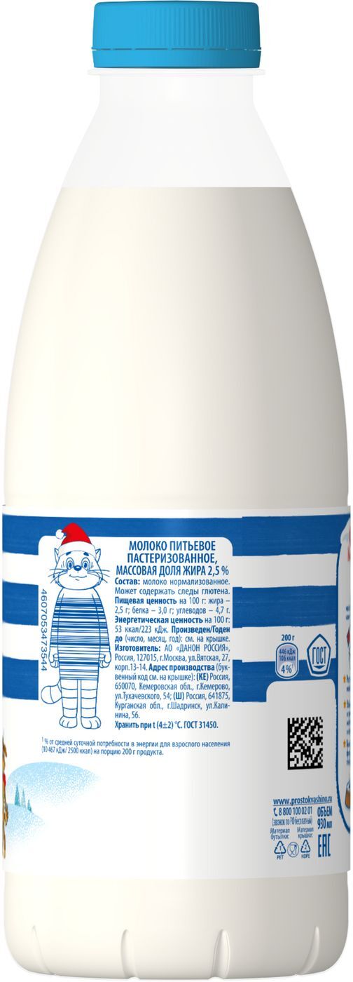 Молоко пастеризованное Простоквашино, 2,5%, 930 мл