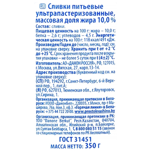 Сливки Простоквашино, ультрапастеризованные, 10%, 350 г
