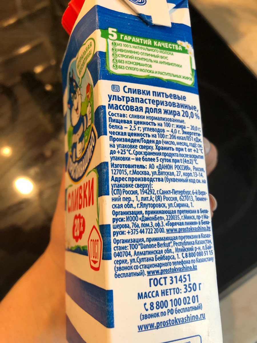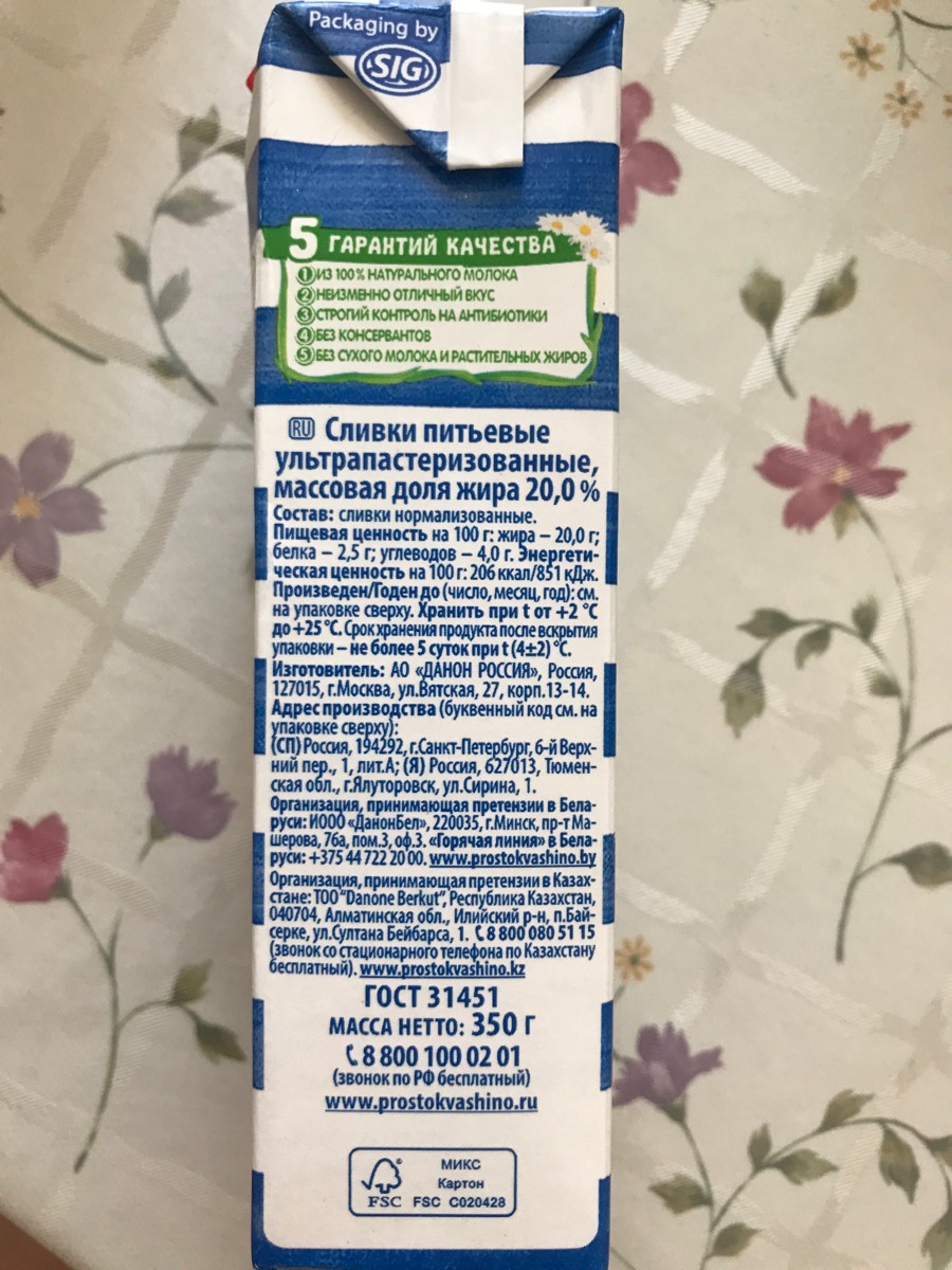 Сливки "Простоквашино" ультрапастеризованные 20%, 350г