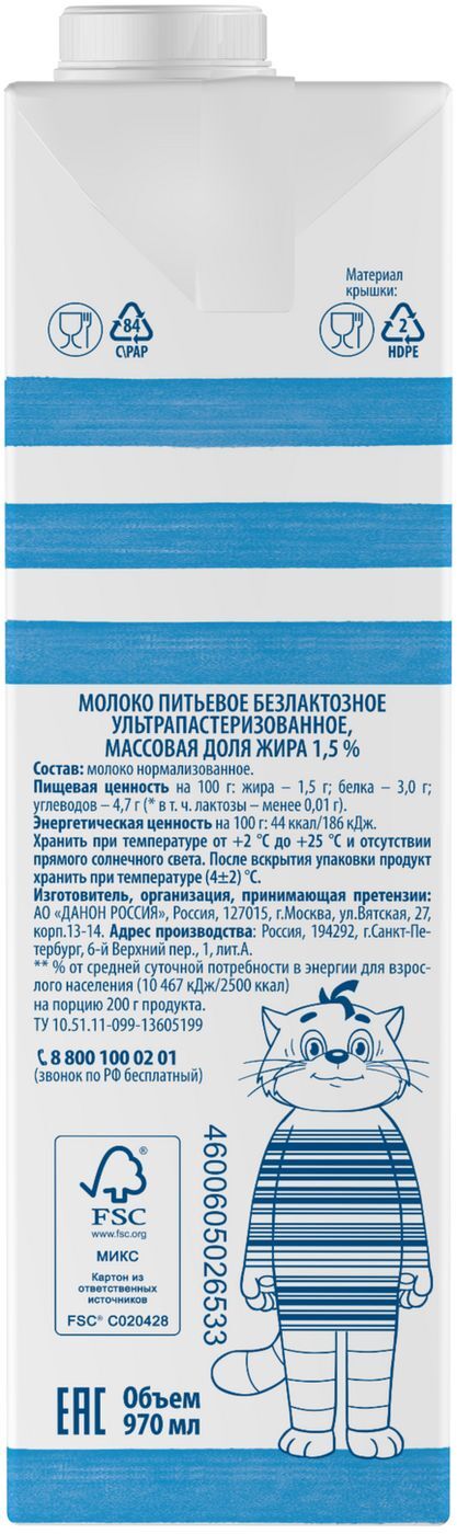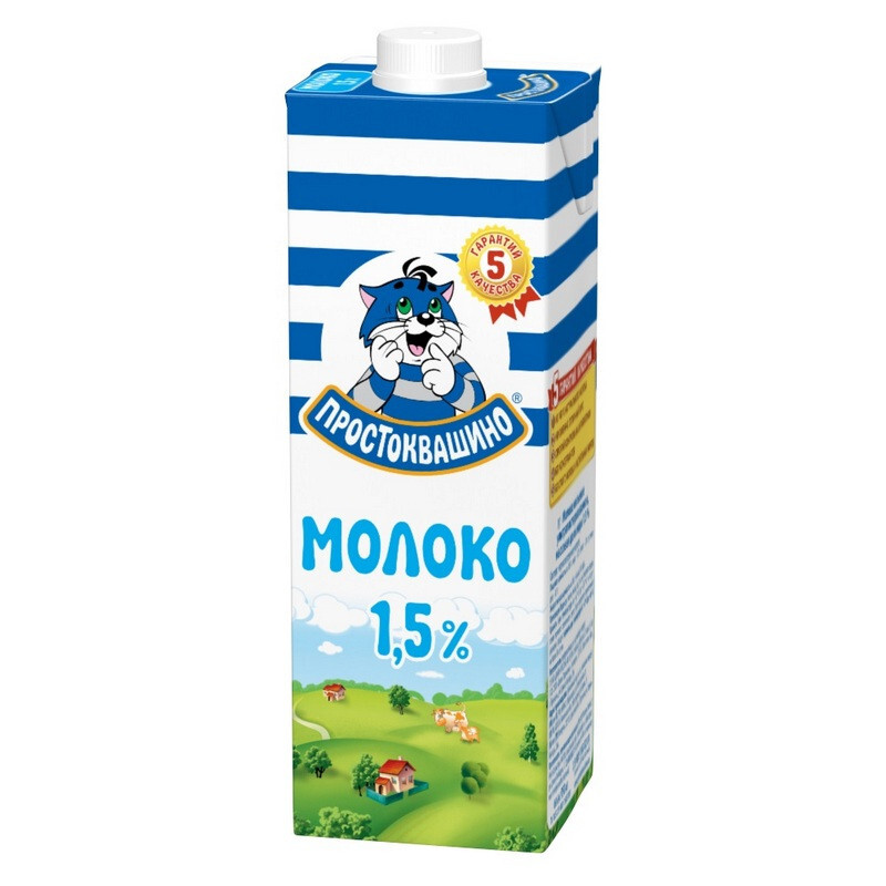 Молоко Простоквашино, безлактозное, ультрапастеризованное, 1,5%, 970 мл