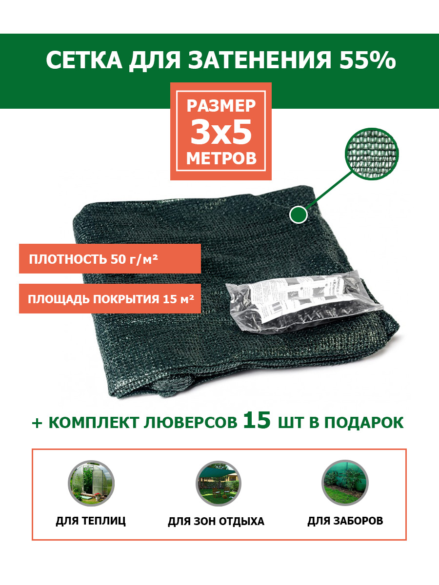 Сетка затеняющая 55%, зеленая 3х5 м (15 м2) + крепёж, для забора, беседки, растений и теплицы
