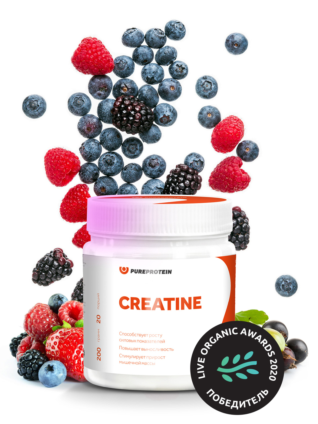 Креатин моногидрат / Creatine / PureProtein / Порции: 40х5г или 20х10г / 200г / Лесные ягоды