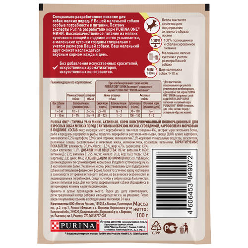 Корм для собак Purina ONE МИНИ Активная с Говядиной, картофелем и морковью в подливе