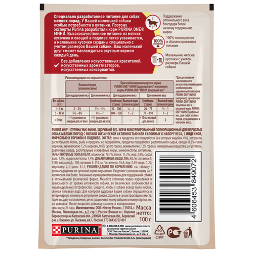 Корм для собак Purina ONE МИНИ Здоровый вес с Курицей, коричневым рисом и томатами в подливе