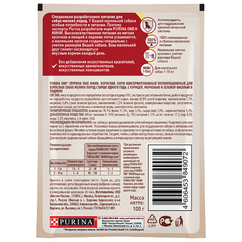 Корм для собак Purina ONE МИНИ Взрослая с Курицей, морковью и зеленой фасолью в подливе