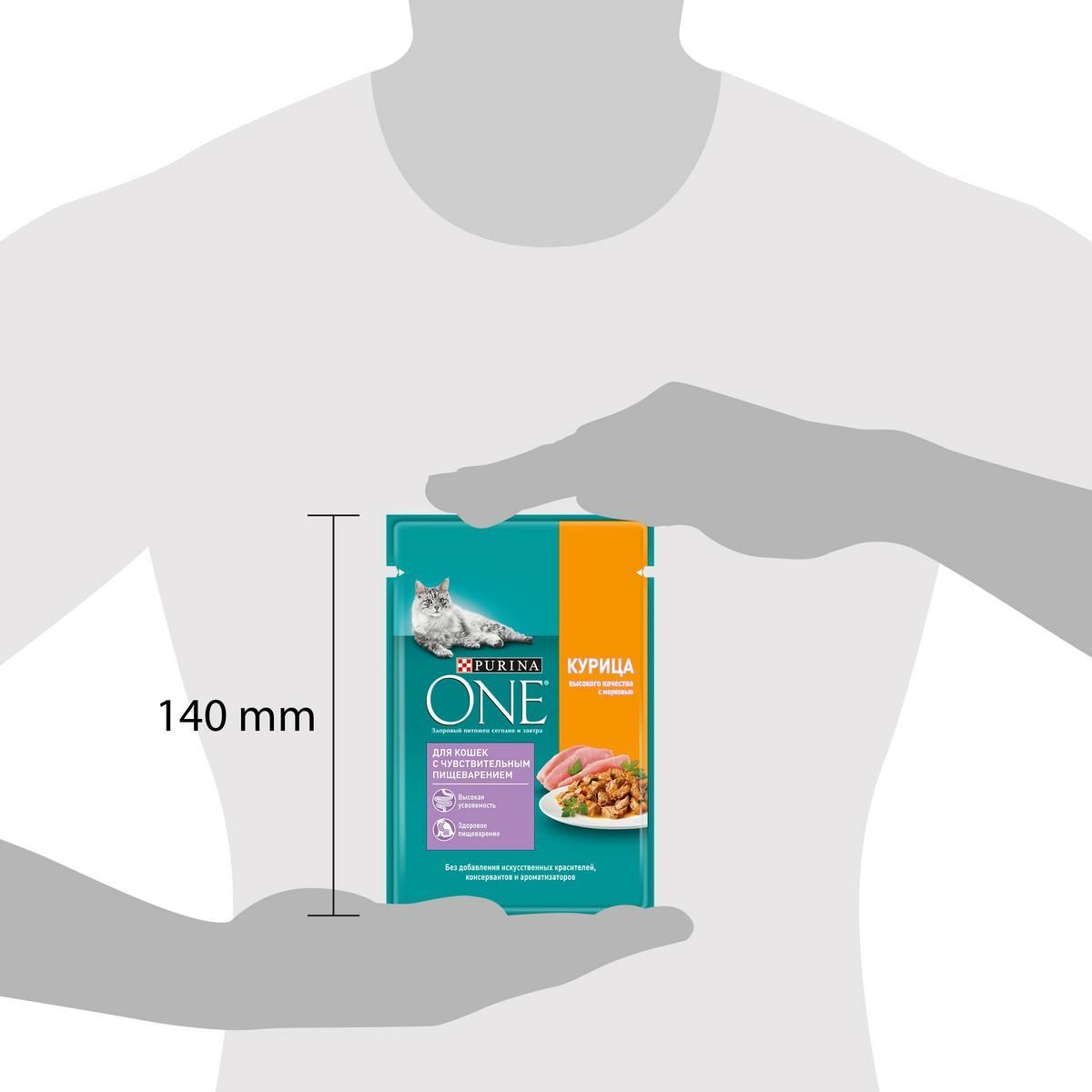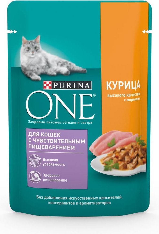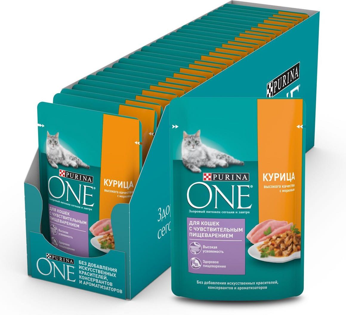 Влажный корм Purina ONE для кошек с чувствительным пищеварением, с курицей и морковью, 26 шт х 75 г