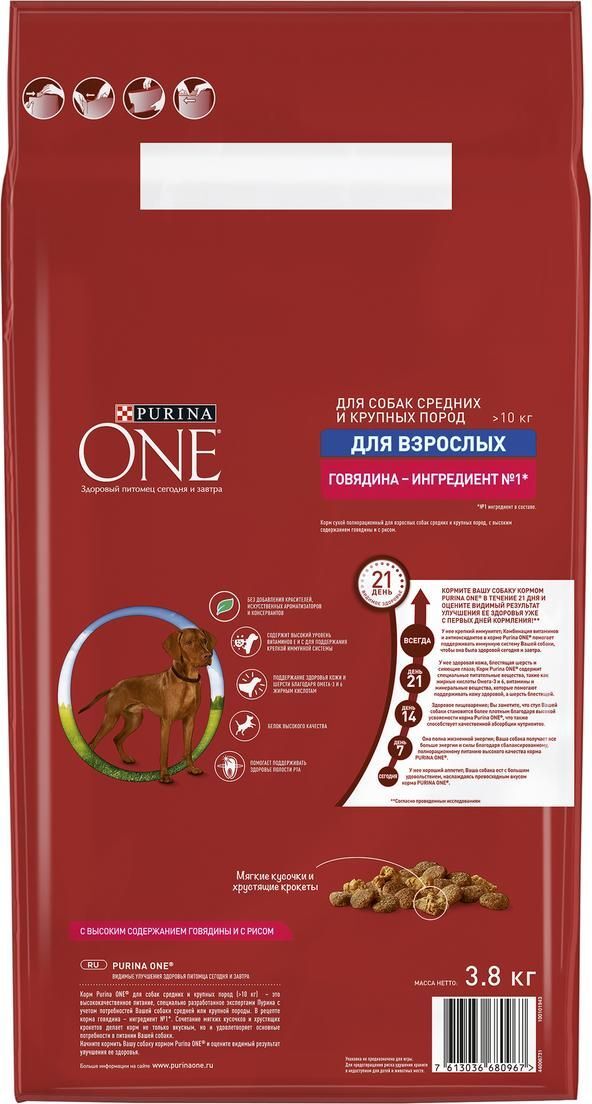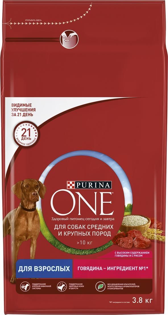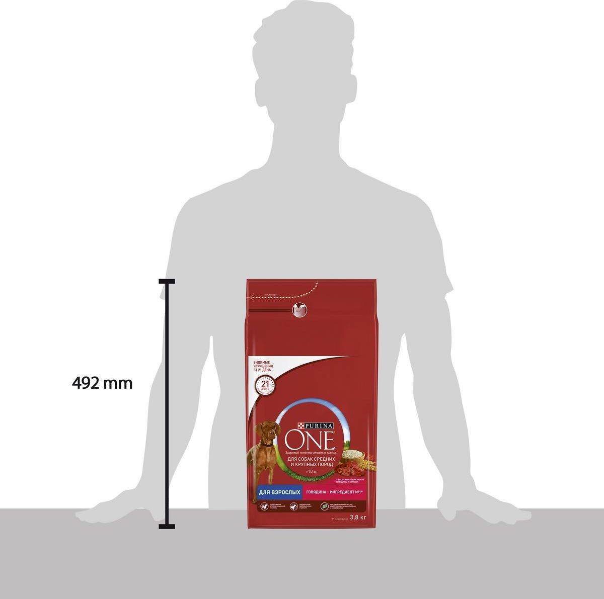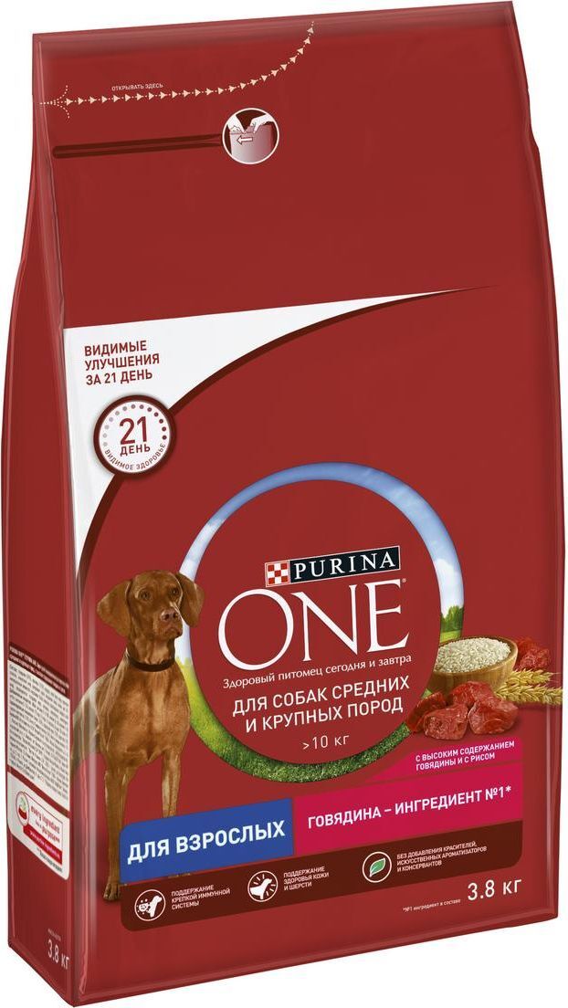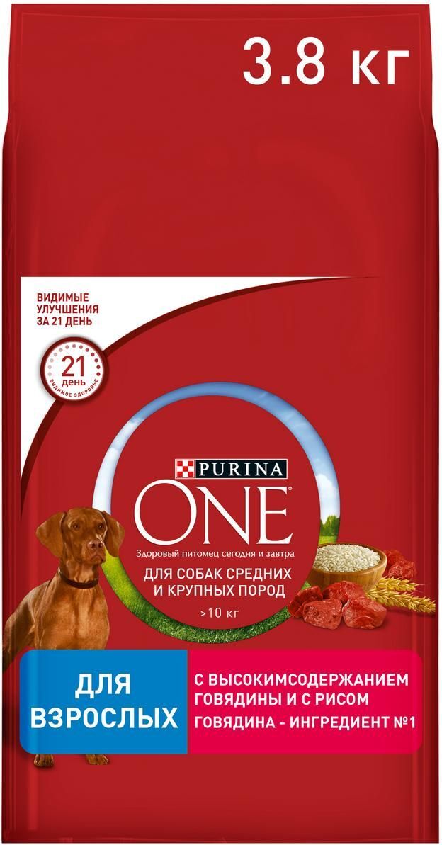 Сухой корм Purina ONE для взрослых собак средних и крупных пород, с высоким содержанием мяса и риса, 3,8 кг