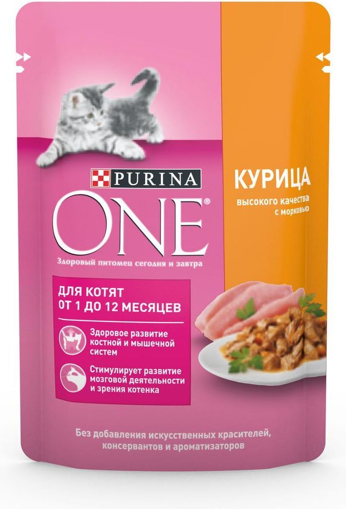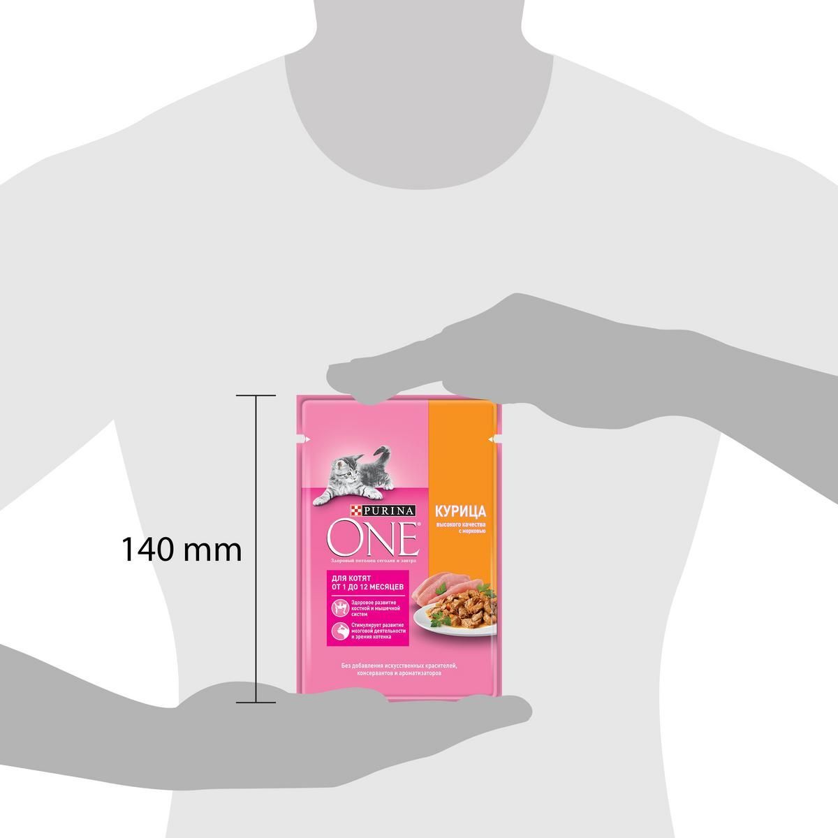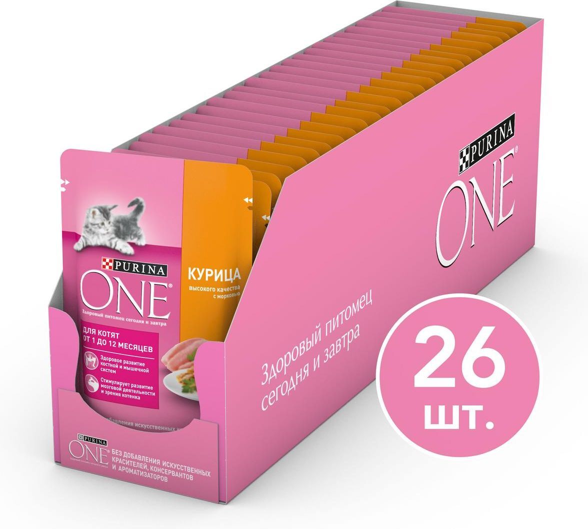 Влажный корм для котят Purina One Kitten, с курицей и морковью, кусочки в соусе 26 х 75 г