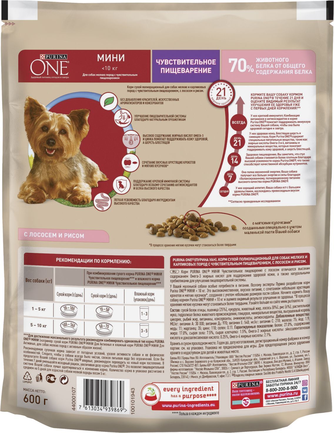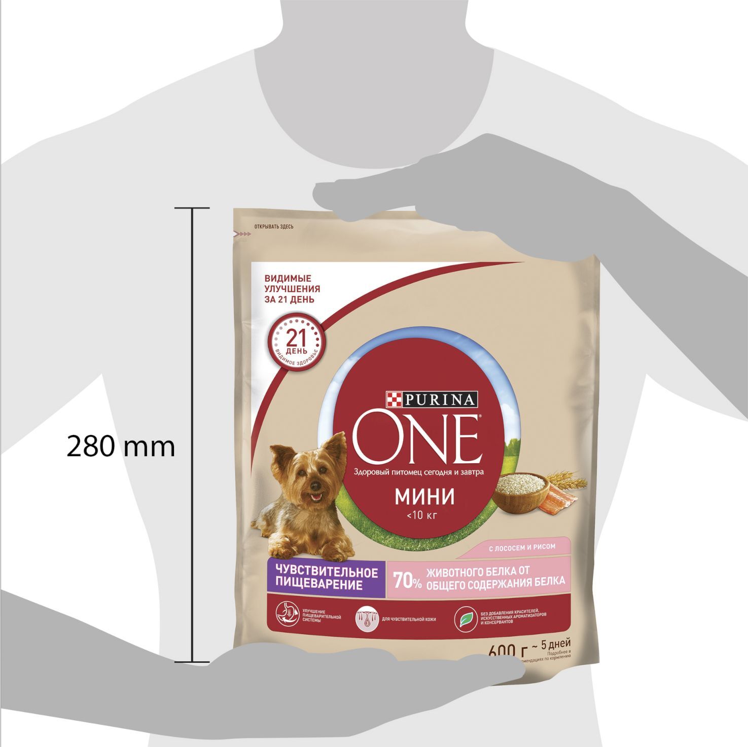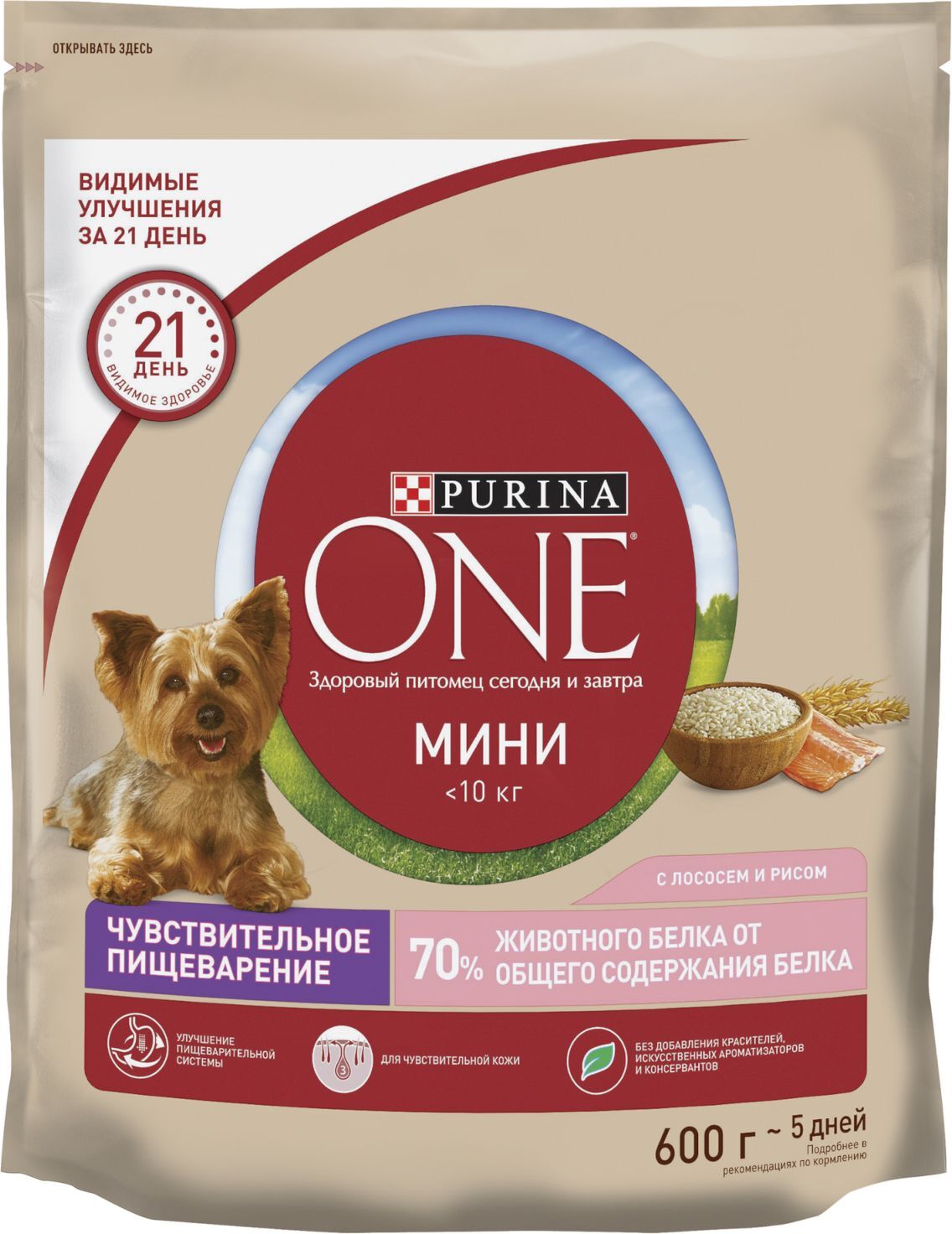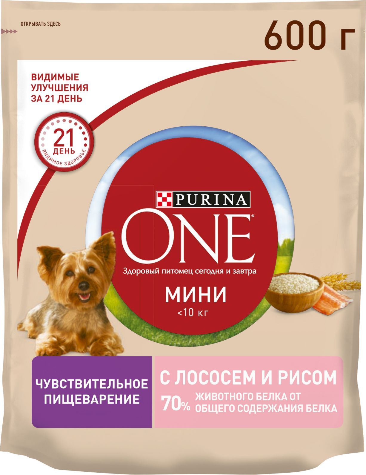 Сухой корм для собак мелких пород Purina One с чувствительным пищеварением, с лососем и рисом, 600 г