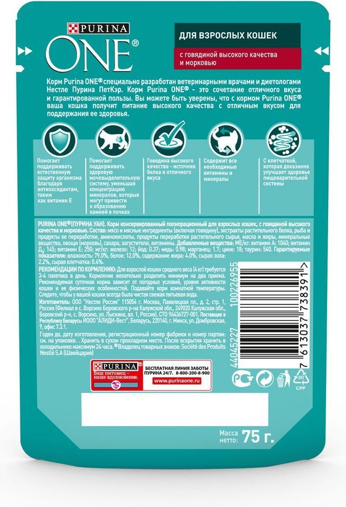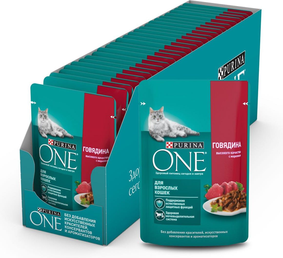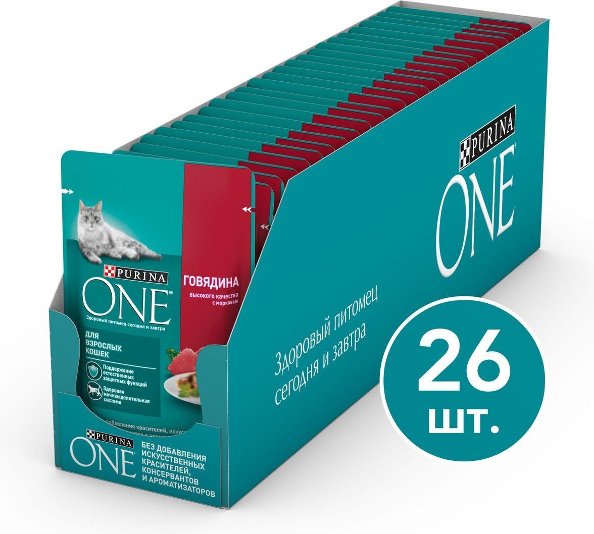 Влажный корм Purina ONE для взрослых кошек, с говядиной и морковью, 26 шт х 75 г