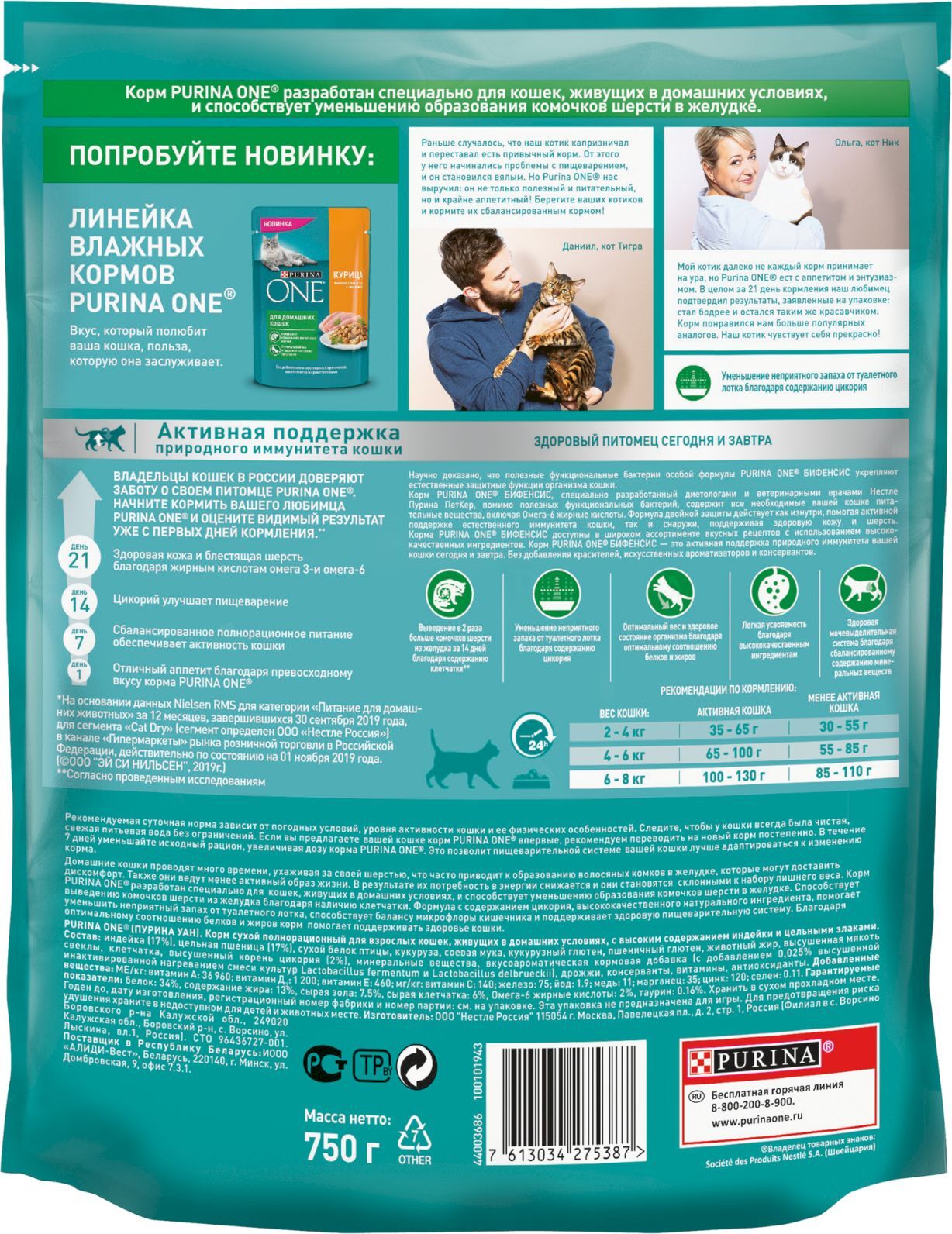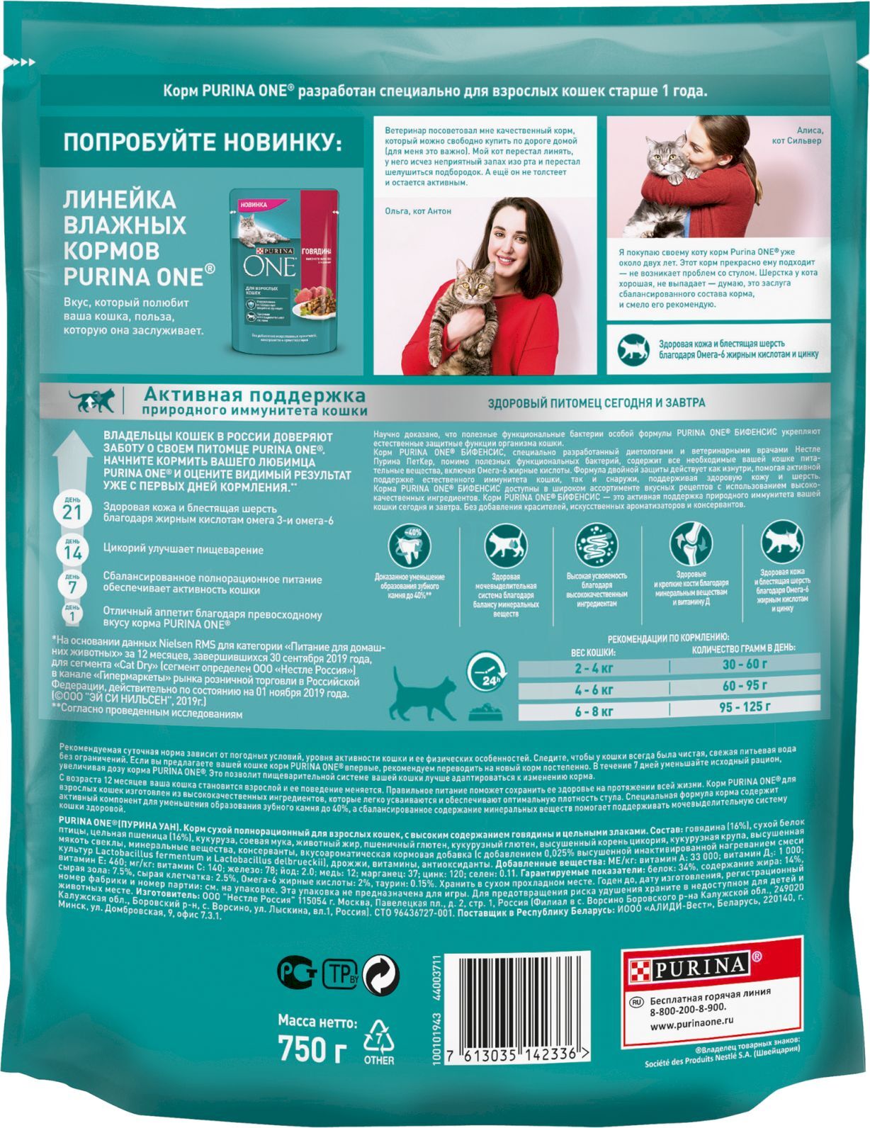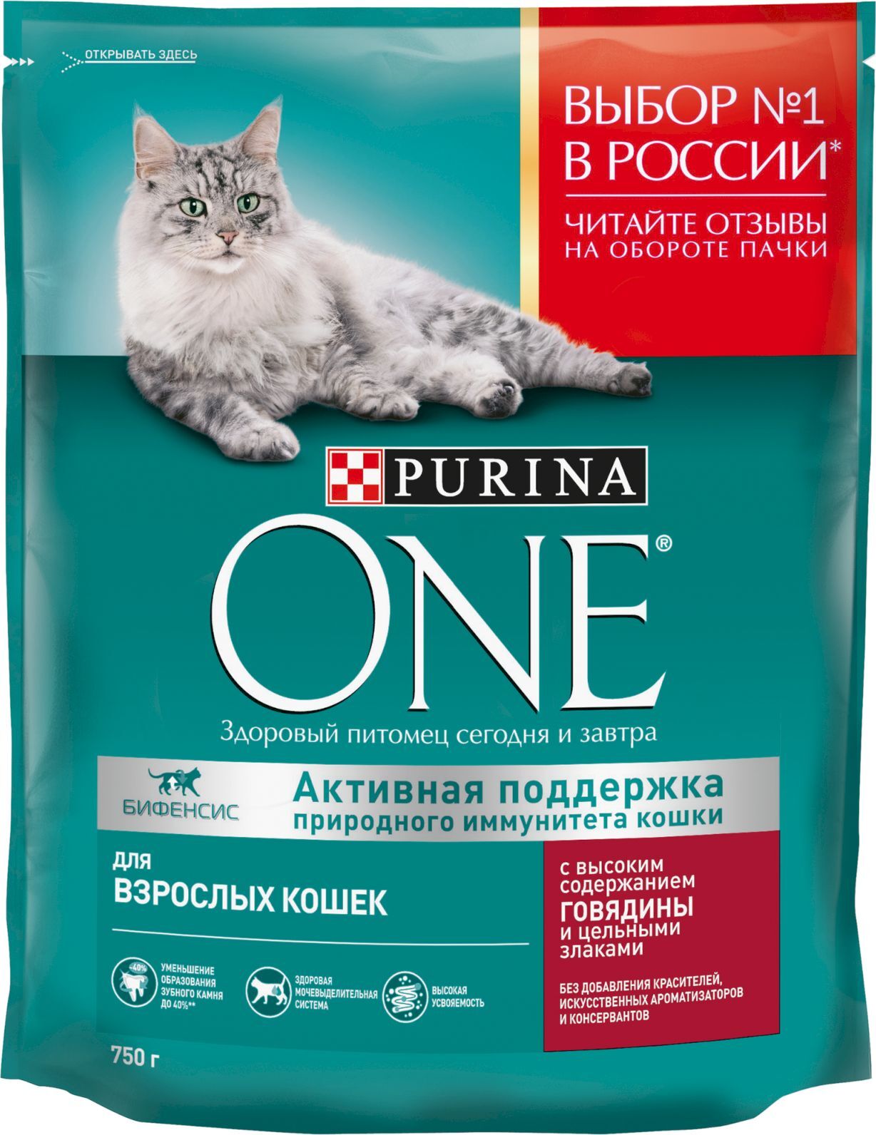 Сухой корм для кошек Purina One, с высоким содержанием говядины и цельными злаками, 750 г