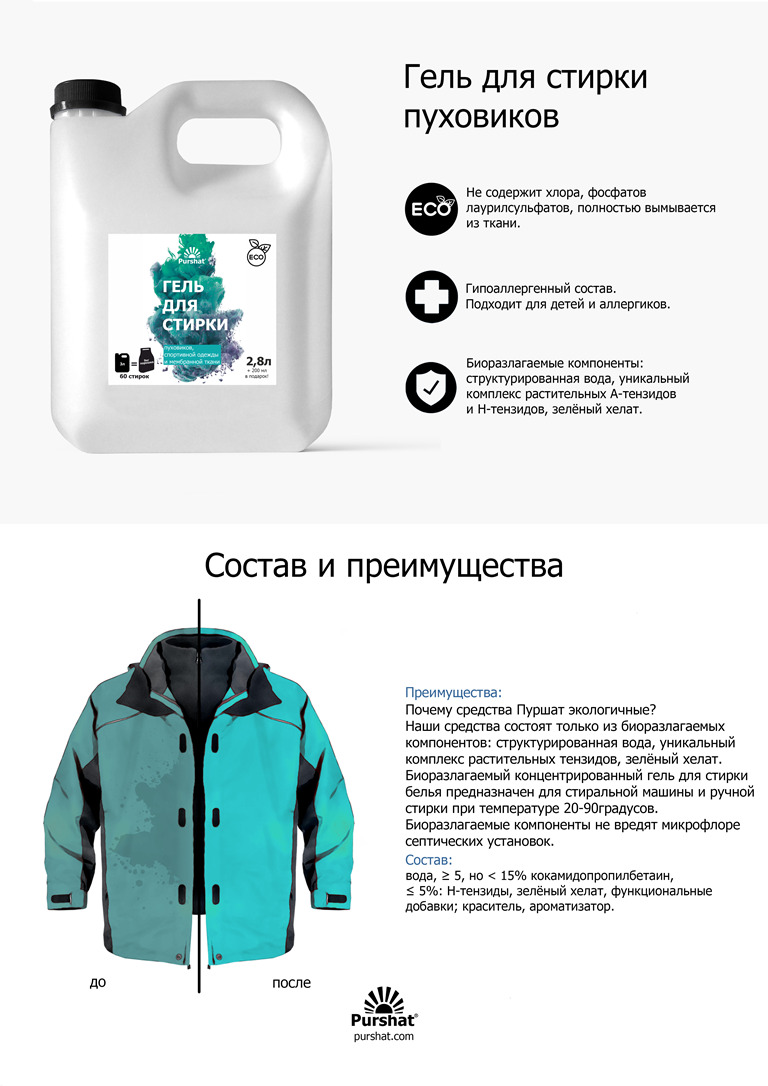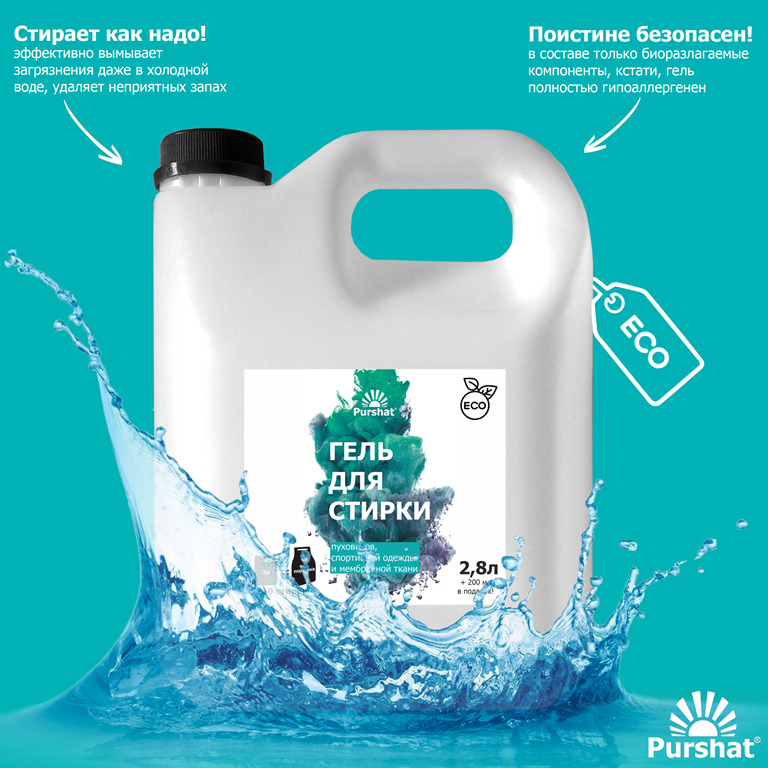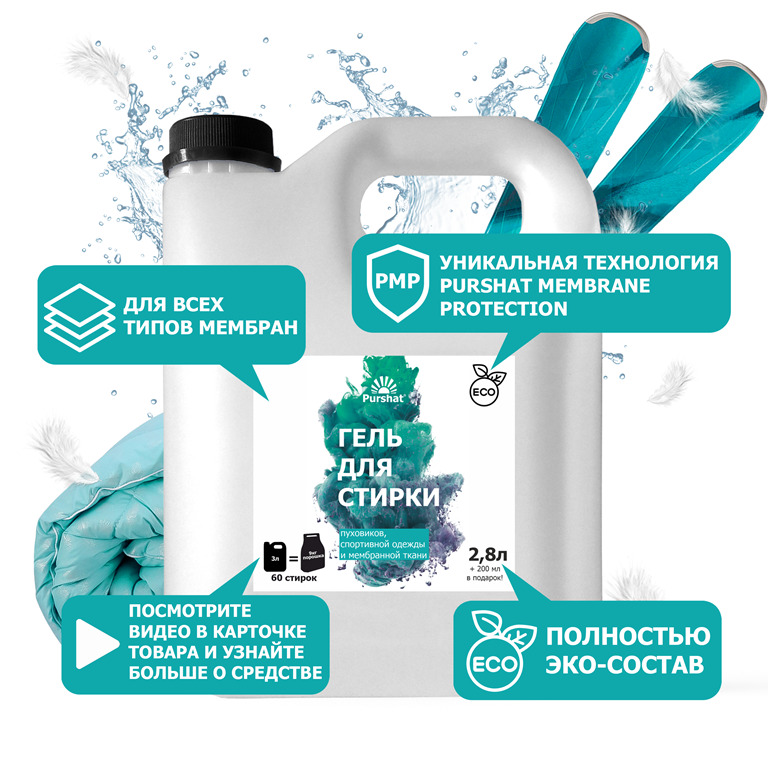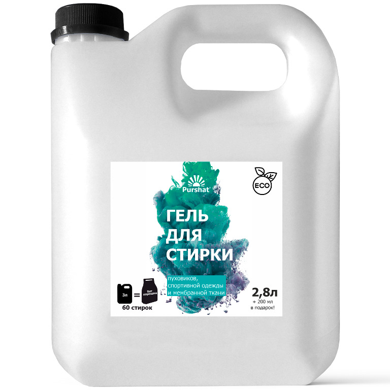 Гель для стирки пуховиков Пуршат для мембраны и спортивной одежды 2800+200 мл в подарок