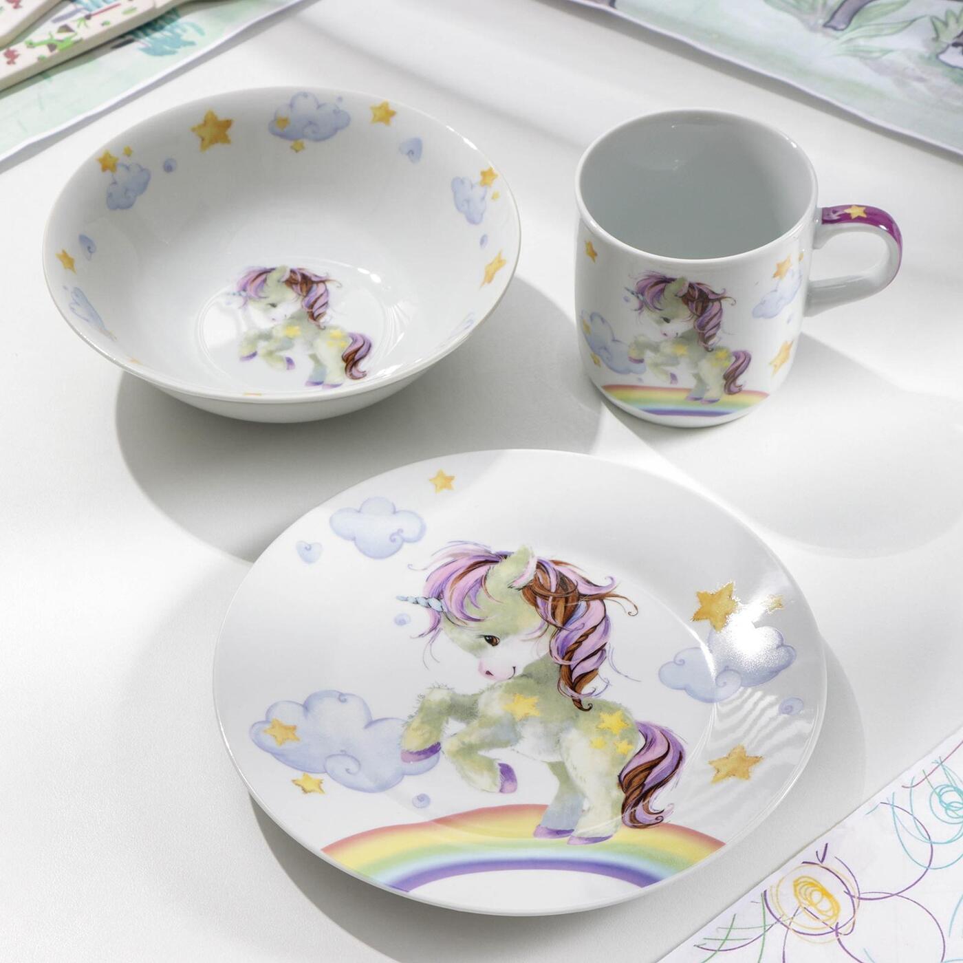 Набор посуды для детей, Единорог, 3 предмета: кружка 230 мл, миска 400 мл, тарелка 18 см