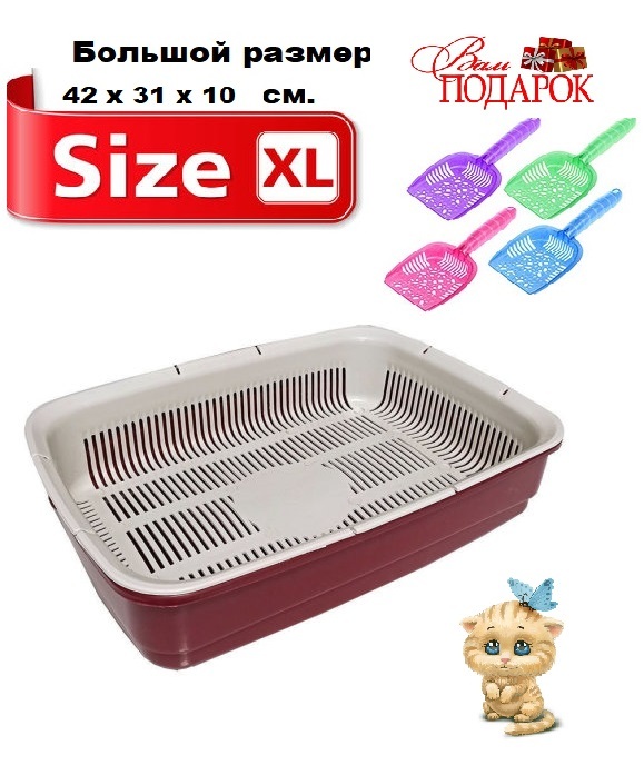 Лоток для кошек / туалет для животных / большой с решеткой и совком, 42 х 31 х 10 см.